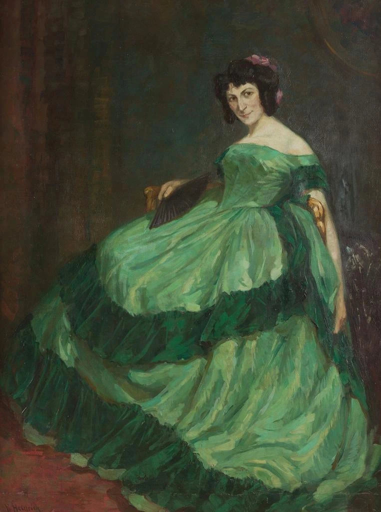 Reproduktion Dame i grøn kjole - Betty Heldrich – Fascinerende introduktion I det rige kunstunivers skiller visse værker sig ud ved deres evne til at fange selve essensen af menneskelige følelser. "Dame i grøn kjole" af Betty Heldrich er et af disse mesterværker, der overskrider tid og rum. Dette maleri, både livligt og delikat, inviterer beskueren til at dykke ned i en verden, hvor farve og form mødes for at fremkalde en personlig historie, en introspektion eller blot en stilfærdig beundring. Fremstillingen af en kvinde iført en skinnende grøn kjole resonnerer med en energi, der synes levende, næsten håndgribelig. Lyset leger over stoffets folder, og damens blik, både mystisk og engagerende, fanger enhver, der dvæler ved dette værk. Værkets stil og særpræg Betty Heldrichs stil er en harmonisk fusion mellem realisme og en impressionistisk tilgang. I "Dame i grøn kjole" er kunstnerens farvepalette dristig, men balanceres med finesse. Grøn, symbol på håb og fornyelse, bliver hovedpersonen i denne komposition, mens subtile nuancer af lys og skygge skaber en næsten drømmeagtig atmosfære. Penselstrøgene, både præcise og frie, vidner om en teknisk mestring, der får kjolen til at leve under beskuerens øjne. Teksturen af lærredet, gennem de minutøse detaljer, fremkalder en følelse af dybde og bevægelse. Hvert element i dette værk bidrager til en visuel fortælling, der inviterer til fortolkning, refleksion og forundring. Kunstneren og hendes indflydelse Betty Heldrich, kunstner med mange talenter, har formået at gøre sig gældende i kunstverdenen takket være sin unikke tilgang og personlige vision. Påvirket af de store mestre fra fortiden formår hun at tilføre sine værker en modernitet, samtidig med at hun hylder de kunstneriske traditioner. Hendes evne til at observere verden omkring hende og oversætte dens skønhed er bemærkelsesværdig. Hvert værk er et spejl af en særlig følsomhed, en opmærksomhed på detaljer og en dyb forståelse af menneskelige følelser. Ved at udforske temaer som kvindelighed, ensomhed og den flygtige skønhed af den