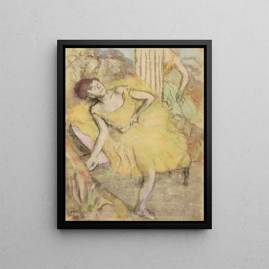 Værkets unikke karakter ligger i, hvordan Degas formår at fange bevægelse og holdning hos en danser, samtidig med at han fremhæver den psykologiske dimension af sit motiv. Kunstneren bruger dristige vinkler og uventede kompositioner, der vidner om hans interesse for den kropslige dynamik. Danseren, siddende, virker både sårbar og stærk, hvilket afspejler en dualitet, der ekkoer af dansens kerne. De varme farver og lyslege skaber en intim atmosfære, mens de fine detaljer i danserens påklædning understreger kunstens raffinement. Pastelteknikken, som Degas foretrak, giver bløde teksturer og subtile nuancer, hvilket gør scenen endnu mere levende. Ved at afvige fra akademiske konventioner tilbyder Degas et moderne og følelsesladet syn på dansen, der fortsat inspirerer kunstnere og kunstelskere verden over.