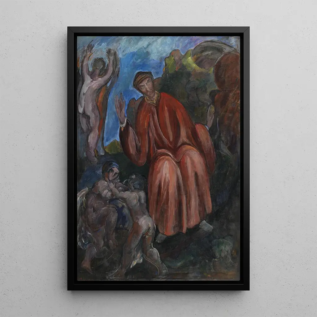 "Dante Prophètes Opus I" af J A Jerichau er et kunsttryk, der dykker seeren ned i et rigt symbolsprog og følelser. Den dynamiske sammensætning, med sine majestætiske figurer og livlige farver, fremkalder en mystisk og kontemplativ atmosfære. Jerichau bruger en maleteknik, der dygtigt blander chiaroscuro, hvilket fremhæver kontrasterne mellem lys og skygge, og styrker den narrative dybde i scenen. Hver figur synes at fortælle en historie, hvilket inviterer til refleksion over de universelle temaer om liv, død og forløsning.