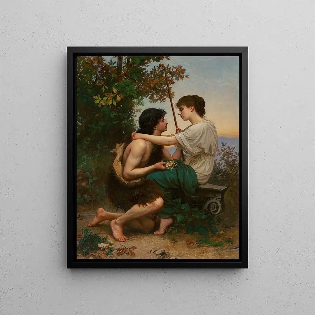 Reproduktion Daphnis og Chloé - Camille Félix Bellanger – Fascinerende introduktion Inden for kunstverdenen overskrider visse værker den simple ramme af maleriet for at blive visuelle fortællinger fyldt med følelser og poesi. "Daphnis og Chloé" af Camille Félix Bellanger er et strålende eksempel. Dette værk, inspireret af den mytologiske kærlighedshistorie mellem Daphnis og Chloé, fremhæver naturens skønhed og følelsernes renhed. Ved at dykke ned i dette kunsttryk bliver seeren straks transporteret til en verden, hvor kærlighed og natur væves sammen, hvilket skaber en atmosfære, der er både fredelig og fortryllende. Finheden i træk og rigdommen i farverne inviterer til en dyb refleksion, hvilket gør hvert blik på maleriet unikt og personligt. Værkets stil og singularitet Bellangers stil skiller sig ud gennem en bemærkelsesværdig finesse og en omhyggelig opmærksomhed på detaljer. I "Daphnis og Chloé" er figurerne gengivet med en ynde og lethed, der næsten virker æteriske. Protagonisternes kroppe, omhyggeligt modelleret, smelter harmonisk ind i en frodig baggrund, hvor naturen spiller en central rolle. Lys- og skyggelege samt subtile nuancer i farverne skaber en intim og romantisk atmosfære. Dette værk nøjes ikke med at skildre en scene; det fortæller en historie, nemlig om en uskyldig og passioneret kærlighed, der udfolder sig i et idyllisk landskab. Hvert element i kompositionen, fra blade til vandreflekser, bidrager til den overordnede harmoni, hvilket gør dette stykke til et sandt mesterværk fra det 19. århundrede. Kunstneren og hans indflydelse Camille Félix Bellanger, fransk kunstner fra det 19. århundrede, formåede at gøre sit indtryk i sin tids kunstlandskab takket være sit ubestridelige talent og sin unikke vision. Påvirket af romantikken og neoklassicismen formåede Bellanger at forene tradition og innovation, hvilket skabte værker, der fanger essensen af menneskelige følelser. Hans arbejde med "Daphnis og Chloé" vidner om hans evne til at omdanne mytologiske fortællinger til rørende visuelle fremstillinger. Bellangers indflydelse stopper ikke ved hans tid; hans kunstneriske tilgang fortsætter med at inspirere mange samtidige kunstnere, der søger