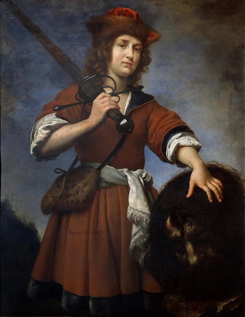 L'œuvre "David med Goliaths hoved" af Carlo Dolci, malet i det 17. århundrede, indkapsler et øjeblik af triumf og mod, og fanger selve essensen af sejren over modgang. Denne ikoniske skildring af den unge hyrdedreng David, der holder det halshuggede hoved af kæmpen Goliath, fremkalder en dyb refleksion over mod og tro. Gennem de omhyggelige detaljer og den dramatiske belysning formår Dolci at formidle en følelsesmæssig intensitet, der går ud over den enkle bibelske fortælling. Scenen, både kraftfuld og rørende, inviterer seeren til at reflektere over de universelle temaer om kamp og forløsning.