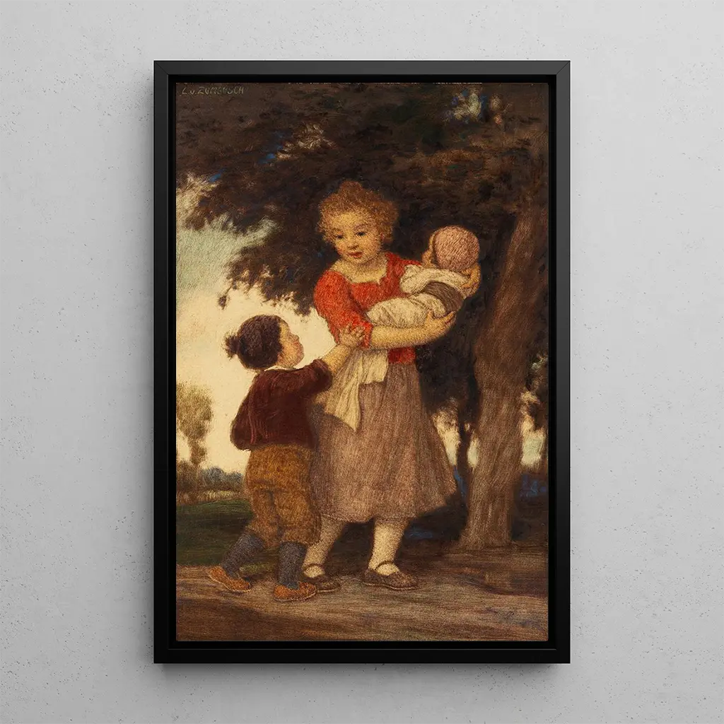 I "Les trois frères et sœurs" skildrer Ludwig von Zumbusch en rørende scene, der vækker følelser af samhørighed og bror- og søskendekærlighed. Kompositionen fremhæver de tre børn, fanget i et øjeblik af leg og glæde, omgivet af en frodig natur, der tilføjer en levende dimension til værket. De livlige farver og de omhyggelige detaljer, typiske for Zumbusch's stil, skaber en varm og indbydende atmosfære. Hvert ansigt udtrykker en oprigtig følelse, hvilket gør dette kunsttryk til mere end blot et familiebillede – det er en fejring af barndommen og de bånd, der forener os.