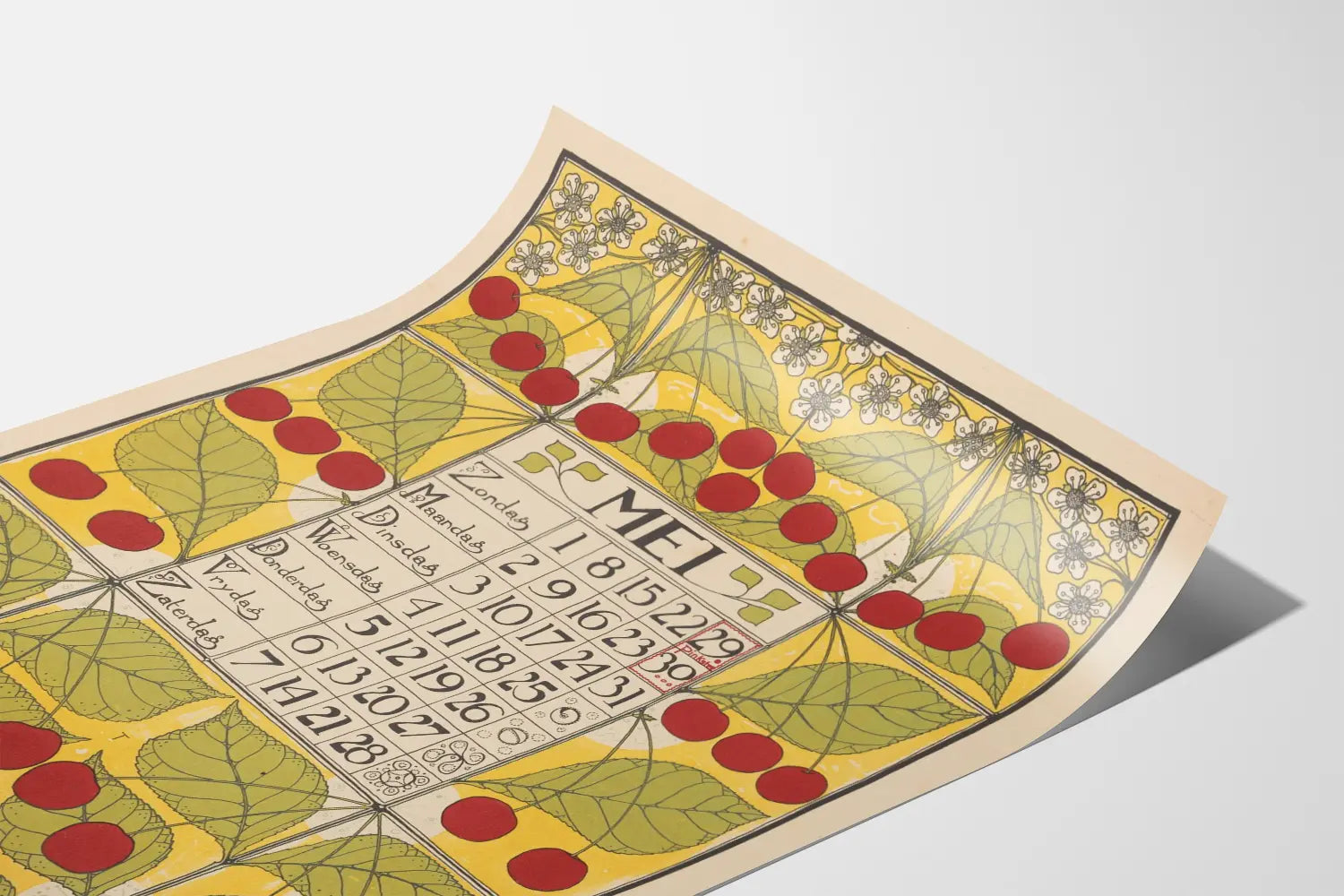 Opdag dette vægkunstplakat, der forestiller en kalender for maj måned 1898, pyntet med stiliserede blomster- og frugtillustrationer. Dette vintage stykke fremhæver en grafisk stil præget af en ramme af grene pyntet med levende røde kirsebær og store grønne blade, på en lys gul baggrund. Den centrale kalender, præsenteret i et klart gitter, viser hver dag i ugen på hollandsk med en elegant og omhyggelig typografi, hvilket tilføjer et strejf af ægthed og tidsperiodecharme til dit hjem.
