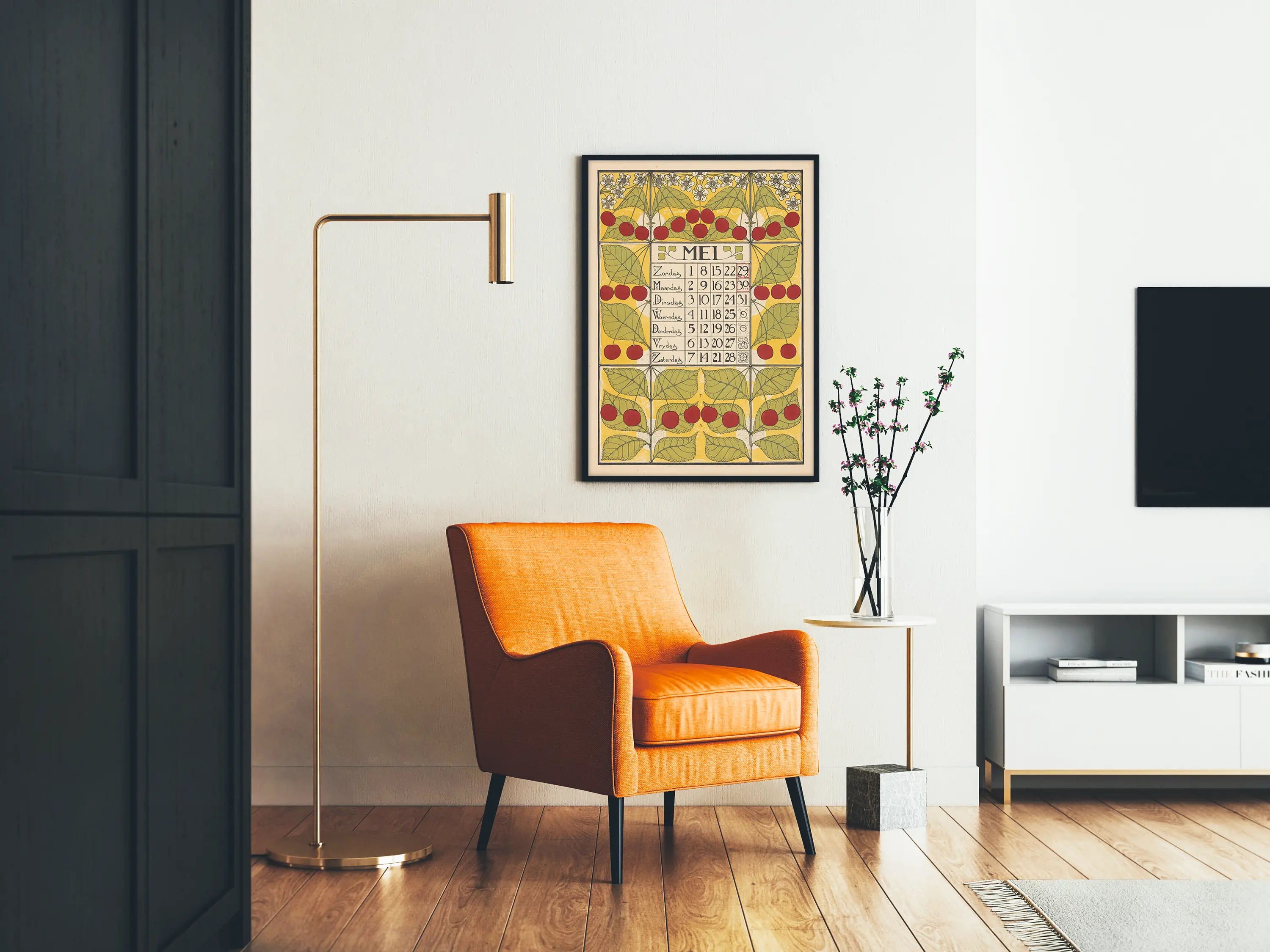 Denne vægplakat er perfekt for elskere af ældre kunst og unik vægdekoration, der kombinerer praktisk funktion med kunstnerisk æstetik. Kompositionen balancerer harmonisk de botaniske elementer og kalenderen, hvilket gør dette billede til et tiltrækkende element for en retro- eller naturlig stemning i et køkken, kontor eller stue. Kirsebærrets røde nuance tilføjer varme og livlighed, mens den omhyggeligt gennemarbejdede geometriske opbygning giver et præcist og behageligt grafisk udtryk.