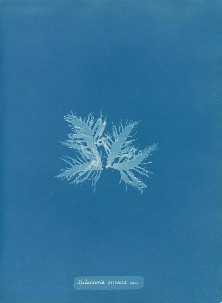 Anna Atkins' stil er præget af en delikatesse og omhu, der kendetegner hendes unikke tilgang. Ved brug af cyanotypeteknik har hun skabt dybt blå tryk, der fremhæver de organiske former af alger, hun har valgt at repræsentere. Hvert stykke er et vidnesbyrd om hendes omhyggelige observation og respekt for naturen. Kunsttrykket af "Delesseria sinuosa var." er ingen undtagelse, og afslører nuancer af blå, der fremkalder dybhavets dybder, samtidig med at de fine detaljer i algernes fronds fremhæves. Denne farvevalg, både beroligende og fængslende, tiltrækker opmærksomhed og inviterer til en omhyggelig betragning. Værket skiller sig ud ved sin evne til at forvandle naturlige elementer til ægte kunstværker, hvor hver skygge og hvert lys bidrager til en harmonisk komposition.