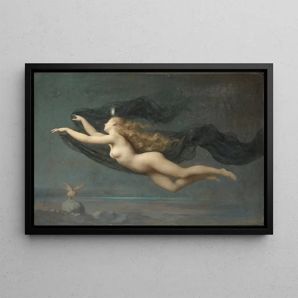 La Nuit : et rejse i den stjernede mørke La Nuit af Auguste Raynaud er et kunsttryk, der inviterer til drømmende refleksion og flugt. Lærredet, domineret af nuancer af dybblå og glitrende guldstrøg, fremkalder en mystisk og fredelig atmosfære. Stjernerne, omhyggeligt malet, synes at danse på den natlige himmel, mens de mørke silhuetter af træer tilføjer dybde til kompositionen. Raynaud formår at fange nattens essens og tilbyder seeren en immersiv og kontemplativ oplevelse. Hvert penselstrøg vidner om en teknisk mestring, der overskrider det simple landskab og forvandler lærredet til et visuelt digt. Auguste Raynaud : en mester i romantisk landskab Auguste Raynaud, aktiv i det 19. århundrede, er kendt for sine poesi- og melankolsk inspirerede kunsttryk. Påvirket af den romantiske bevægelse, indskriver han sig i en kunstnerisk tradition, der værdsætter naturen og følelsen. Raynaud har formået at udnytte teknikkerne i oliepaintings til at skabe stemningsfulde atmosfærer, ofte inspireret af natlige scener. Hans arbejde, selvom det er mindre kendt end nogle af hans samtidige, har bidraget til at berige den franske kunstarv og vidner om en unik følsomhed over for den naturlige verdens skønhed. En dekorativ erhvervelse med mange fordele Kunsttrykket af La Nuit er et ideelt valg til at forskønne dit hjem, uanset om det er i en stue, et kontor eller et soveværelse. Dets beroligende farvepalette og drømmende atmosfære tilføjer et strejf af ro til ethvert rum. Kvaliteten af kunsttrykket sikrer en bemærkelsesværdig trofasthed til det originale værk, hvilket gør det muligt at nyde hver detalje. Ved at integrere dette kunsttryk i din indretning giver du dit miljø en kunstnerisk og poetisk dimension, samtidig med at du vækker beundring hos dine gæster.