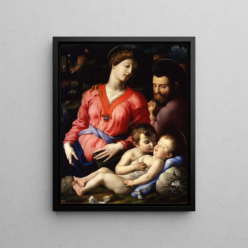 Agnolo Bronzino, en central figur i den florentinske renæssance, formåede at forene tradition og innovation gennem sin karriere. Elev af Pontormo, udviklede han en personlig stil, der adskilte ham i manérismens strømning. Hans beherskelse af portrætter og religiøse kompositioner har givet ham varig anerkendelse, både i hans tid og blandt efterfølgende generationer. Bronzino spillede også en vigtig rolle i spredningen af humanistiske ideer, idet han integrerede klassiske referencer og en refleksion over menneskets natur i sine værker. La Sainte Famille Panciatichi afspejler denne dualitet mellem det hellige og det verdslige, samtidig med at den fremhæver den familie- og beskyttende side af den kristne tro. Hans indflydelse varer ved gennem århundrederne, og inspirerer kunstnere og kunstelskere, der ser ham som en uovertruffen mester.