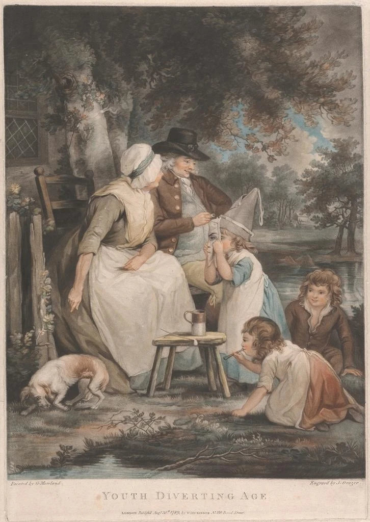 I "ungdom underholder alderdommen" fanger George Morland et øjeblik af ømhed og glæde. Kompositionen skildrer livlige unge mennesker, der omgiver en ældre mand, som synes at lade sig rive med af øjeblikkets lethed. De varme og livlige farver, med strejf af grøn og gul, skaber en atmosfære af lykke og samhørighed. Morlands teknik, der dygtigt blander realisme med en vis idealisering, skaber en rørende kontrast mellem ungdommens vitalitet og alderdommens visdom. Dette kunsttryk fremkalder en blid melankoli, en fejring af livet gennem tiderne.