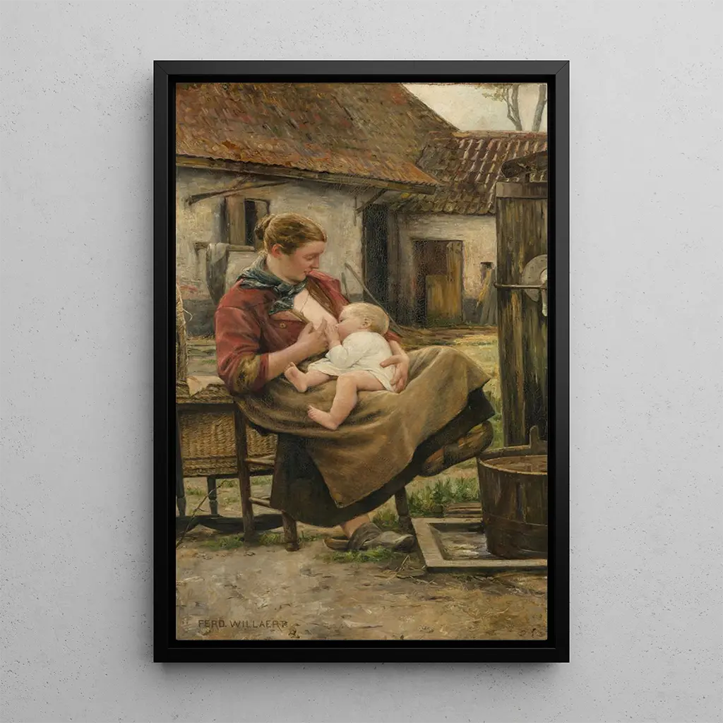 I denne kunsttryk af Den unge mor fanger Ferdinand Willaert et intimt øjeblik mellem en mor og hendes barn. Kompositionen skiller sig ud med bløde og varme farver, der skaber en atmosfære af ro og beskyttelse. De omhyggelige detaljer i moderens ansigt samt den delikate foldning af tøjet vidner om en bemærkelsesværdig teknisk kunnen. Det bløde lys, der belyser scenen, fremhæver den ømhed, dette moderlige bånd udstråler, og inviterer betragteren til at føle den palpable følelse, der udspringer af dette værk.