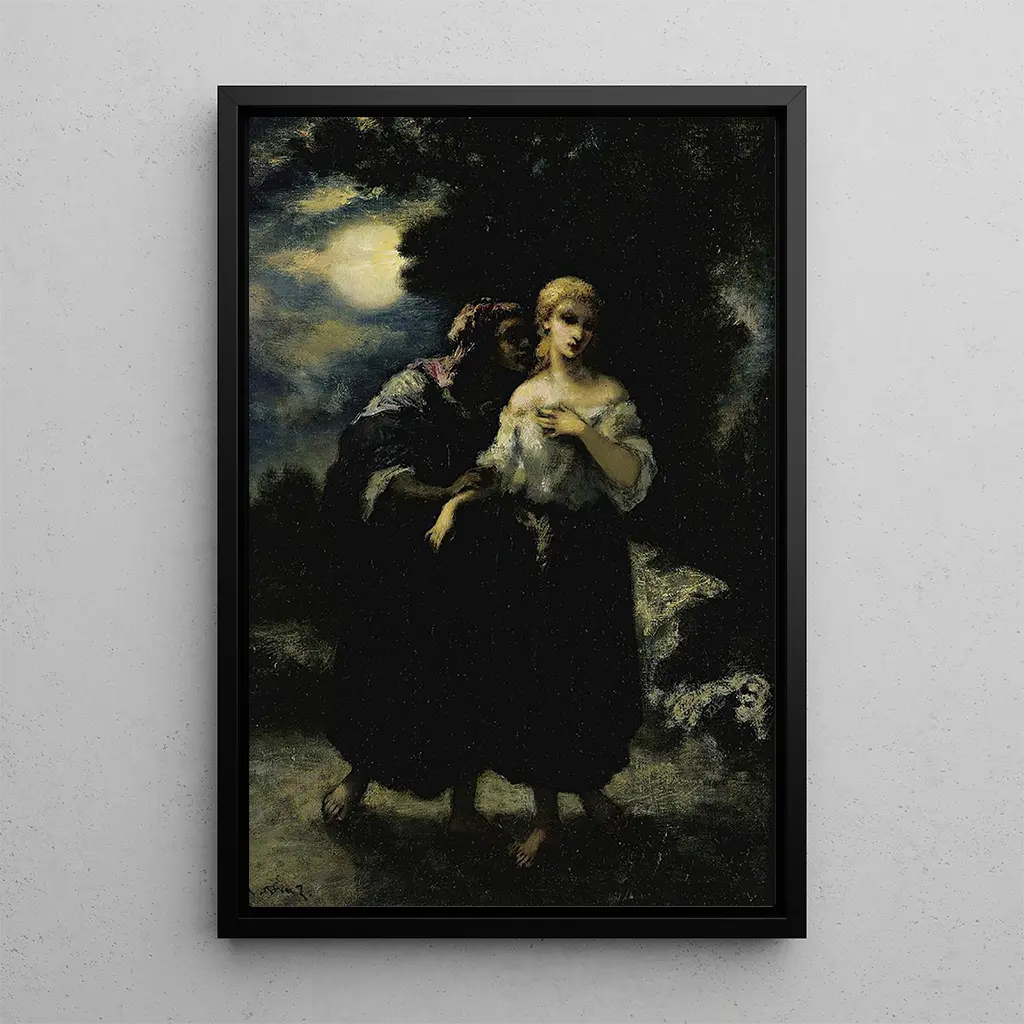 Le Maléfice, kunsttryk af Narcisse Virgile Diaz de la Peña, fremkalder et mystisk univers, hvor naturen og fantasien mødes. Lærredet, rigt på varme farver og delikate nuancer, skildrer et fortryllende landskab, hvor lyset filtrerer gennem bladene. Teknikken med oliemaling, udført med stor dygtighed, giver dette kunsttryk en atmosfære, der både er drømmende og foruroligende. De organiske former blander sig med fantastiske elementer, hvilket skaber en sammensætning, der inviterer til eftertanke og flugt. Hvert detalje, hver penselstrøg, synes at hviske glemte hemmeligheder, og transporterer betragteren til en verden, hvor kunsttrykket får liv.