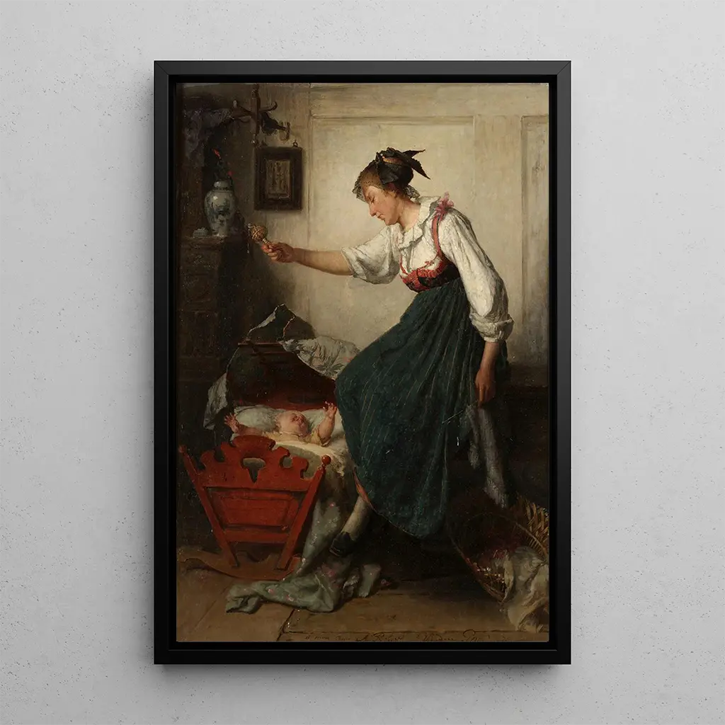 I dette delikate kunsttryk fanger Théodore Gérard et intimt øjeblik mellem en mor og hendes barn. Kompositionen er omhyggeligt arrangeret, med fokus på karakterernes udtryk, hvilket afslører en blid og varm atmosfære. Pastelfarver dominerer, hvilket skaber en beroligende stemning, mens de fine detaljer i tøjet og tilbehøret tilføjer en realistisk dimension til scenen. Gérards teknik, der kombinerer oliemaling og lysstrøg, giver liv til denne rørende skildring af moderskab.