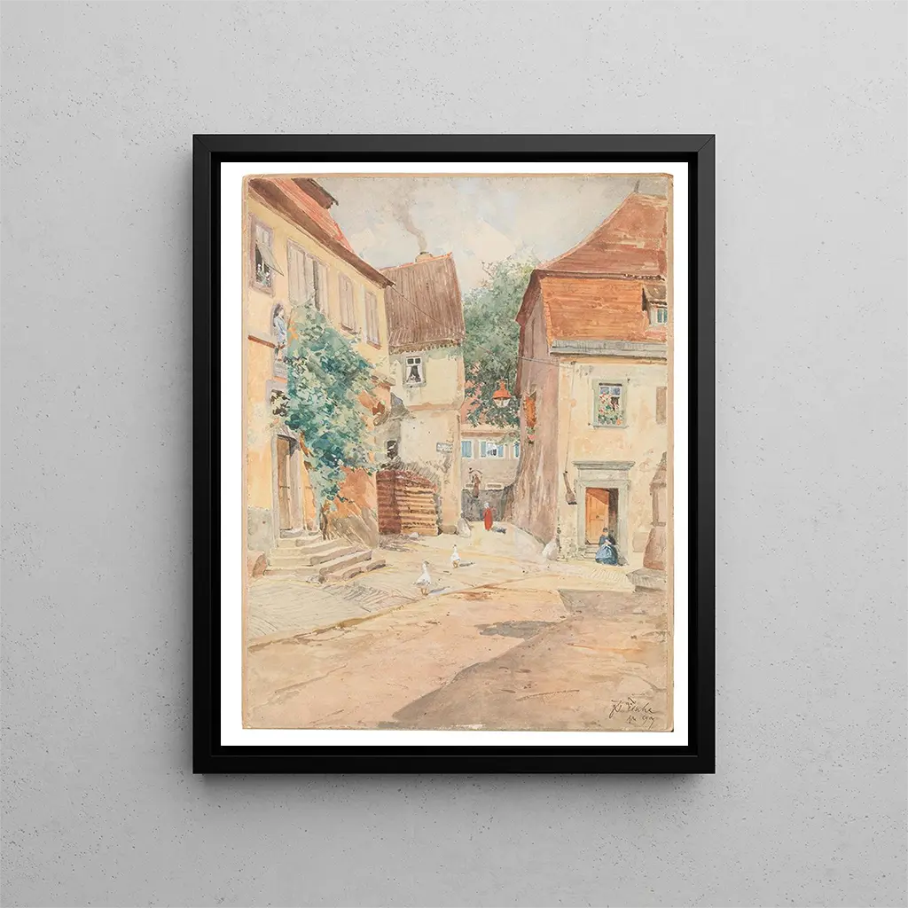 Reproduktion Dettelbach - Eduard Zetsche – Indledende fascinerende Reproduktion Dettelbach - Eduard Zetsche tager os med ind i en verden, hvor kunst og historie mødes med sjælden elegance. Dette værk, der udspringer af en visionær kunstners talent, inviterer os til at udforske nuancerne i et landskab præget af ro og mysterium. Gennem delikate farver og harmoniske former formår Zetsche at fange essensen af naturen, samtidig med at han tilfører en næsten åndelig dimension. Dette maleri er meget mere end blot en simpel gengivelse; det er en ægte følelsesmæssig rejse, et åbent vindue til en verden, hvor tiden synes at stå stille. Værkets stil og særpræg Eduard Zetsches stil skiller sig ud ved sin evne til at forene realisme og poesi. I Dettelbach formår han at skabe en atmosfære, der er både velkendt og drømmende. De fine detaljer i scenen, hvad enten det er teksturerne af træerne eller refleksionerne i vandet, vidner om en imponerende teknisk kunnen. Hvert penselstrøg synes at være fyldt med mening, hver nuance af farve bidrager til en visuel fortælling, der transporterer betragteren. Kompositionen, omhyggeligt orkestreret, inviterer til en langvarig eftertanke, hvilket giver hver enkelt mulighed for at dykke ned i denne unikke verdensvision. Værket udfolder sig som et visuelt digt, hvor hvert element bidrager til opbygningen af en følsom fortælling, der svinger mellem drøm og virkelighed. Kunstneren og hans indflydelse Eduard Zetsche, en ikonisk skikkelse i sin tids kunstbevægelse, har formået at gøre sig bemærket gennem sin unikke tilgang og sin følsomhed over for hverdagens skønhed. Uddannet ved de store kunstskoler har han udviklet en stil, der er hans egen, og som blander tradition og innovation. Hans indflydelse strækker sig langt ud over hans egne værker og inspirerer mange samtidige kunstnere til at udforske grænserne for repræsentation. Zetsche har altid haft som mål at fejre naturen og dens vidundere, hvilket gør hans værker til en hyldest til den skønhed, der omgiver os. Hans skarpe blik på verden har gjort det muligt at genopdage ofte oversete landskaber og forvandle dem til ægte kunstværker. Gennem sine lærreder minder han os om vigtigheden af forbindelsen mellem mennesket og dets omgivelser – et budskab med en stærk aktualitet. En dekoration