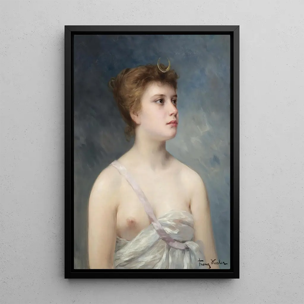 I dette fængslende værk skildrer Franz Xaver Kosler Diane, jagtgudinden, med bemærkelsesværdig ynde og elegance. Kompositionen er præget af bløde farver og nuancer af grøn og blå, der fremkalder den omkringliggende natur. Kunstnerens teknik, der dygtigt blander realisme og romantik, skaber en fredelig og kontemplativ atmosfære. De minutøse detaljer i ansigtet og klædedragtene fremhæver Dianas tidløse skønhed, mens lyset leger over hendes hud og understreger hendes guddommelige aura. Dette kunsttryk af Diane er en ægte invitation til fordybelse og beundring.