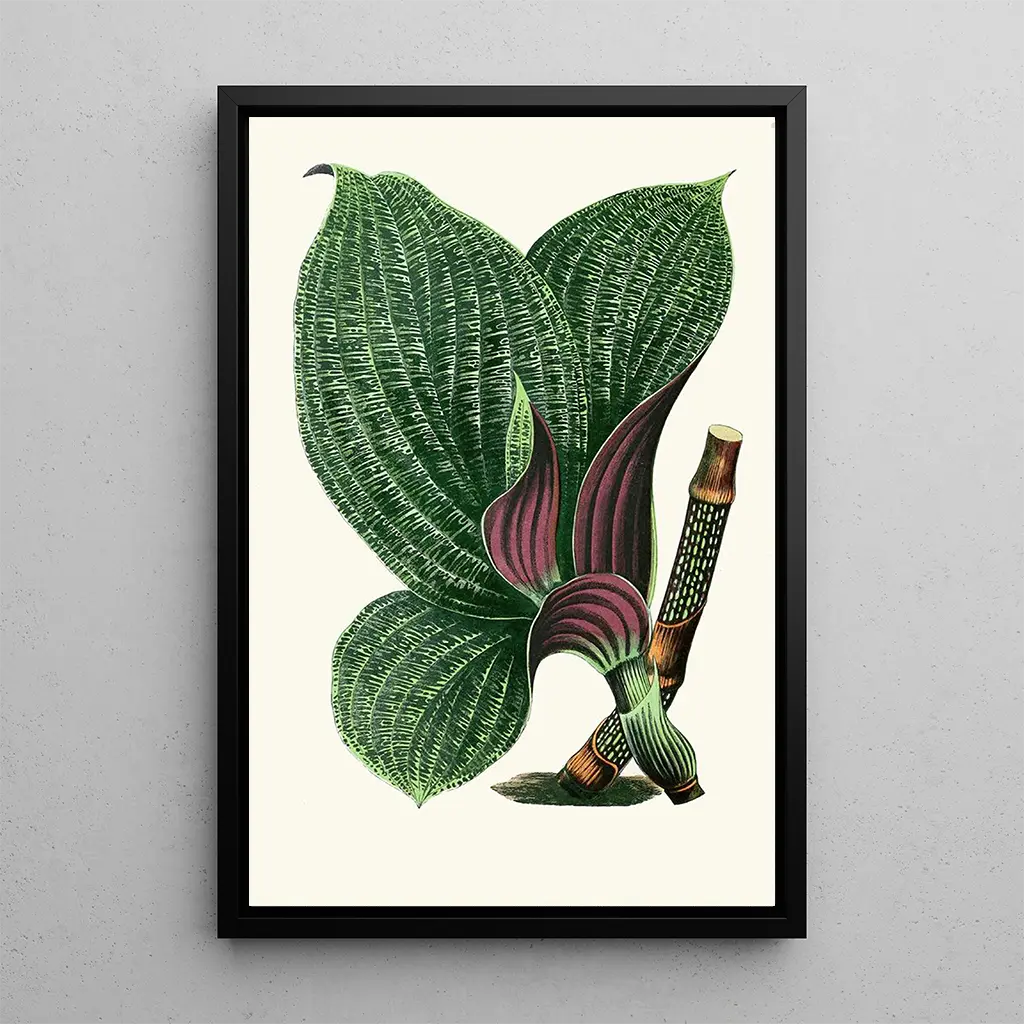 En kunsttryk af lærredet "Dichorisandra Mosaica" af Edward Joseph Lowe tager os med ind i en livlig verden, hvor naturen udtrykker sig med kraft. Nuancerne af blå, grøn og violet blander sig harmonisk og skaber en atmosfære, der både er beroligende og dynamisk. Kunstnerens teknik, der bruger præcise penselstrøg og subtile overgange, giver liv til denne eksotiske plante. Hvert detalje, fra delikate blade til robuste stængler, er gengivet med en omhu, der inviterer til iagttagelse. Dette værk er en sand hyldest til skønheden i den tropiske flora, der fanger øjet og sindet.