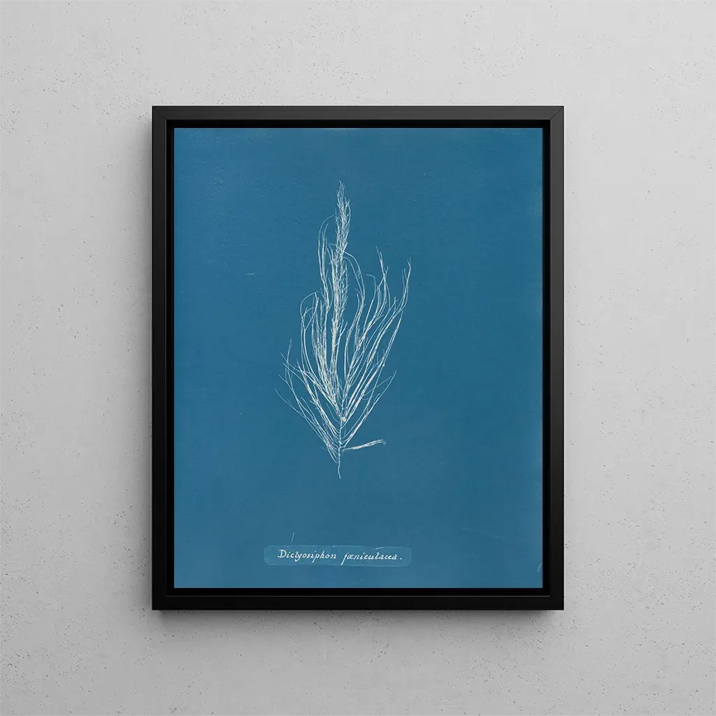 Reproduktion Dictyosiphon foeniculacea - Anna Atkins – Introduktion fascinerende I det fascinerende univers af kunsthistorie skiller visse værker sig ud ved deres evne til at fange den flygtige skønhed i naturen. "Dictyosiphon foeniculacea" af Anna Atkins er en af disse kreationer, der transcenderer det enkle kunstneriske register for at indskrive sig i en videnskabelig og æstetisk tilgang. Skabt i det 19. århundrede, vidner dette ikoniske værk om mødet mellem kunst og botanik, og afslører en verden, der ofte er usynlig for vores øjne. Gennem dette kunsttryk fremhæves selve essensen af naturen, hvilket giver en visuel oplevelse, der inviterer til eftertanke og refleksion. Stil og eneståendehed af værket Eneståendeheden af "Dictyosiphon foeniculacea" ligger i dens innovative tilgang til botanisk fotografi. Anna Atkins, pioner inden for dette felt, bruger cyanotypi, en fotografisk teknik der skaber dybblå tryk, til at indfange de marine alger. Dette kunsttryk skiller sig ud med sin delikate æstetik og harmoniske komposition, hvor hver detalje er omhyggeligt fremhævet. De organiske former af alger, med deres teksturer og nuancer, udfolder sig på papiret og skaber en visuel dans, der fremkalder vandets flydendehed og den marine livs lethed. Ved at afvige fra de maleriske konventioner i sin tid, formår Atkins at etablere en dialog mellem kunst og videnskab, og hylder den naturlige skønhed, mens hun udforsker mulighederne, der åbnes af nye teknologier. Kunstneren og hendes indflydelse Anna Atkins, ofte anerkendt som den første kvindelige fotograf, markerede sin tid med sin dristighed og vision. Hendes arbejde begrænser sig ikke til blot at repræsentere planter; det indskriver sig i en bredere tilgang, der har til formål at dokumentere og bevare biodiversiteten. Ved at fokusere på alger åbner Atkins vejen for en ny form for kunst, der kombinerer videnskabelig præcision med kunstnerisk følsomhed. Hendes indflydelse varer ved i dag, og inspirerer mange kunstnere og fotografer, der søger at udforske forholdet mellem natur, videnskab og æstetik. Gennem sine værker minder hun os om vigtigheden af observation og bevarelse af vores miljø, samtidig med at hun fejrer den iboende skønhed i naturen. En enestående vægdekoration signeret Artem Le