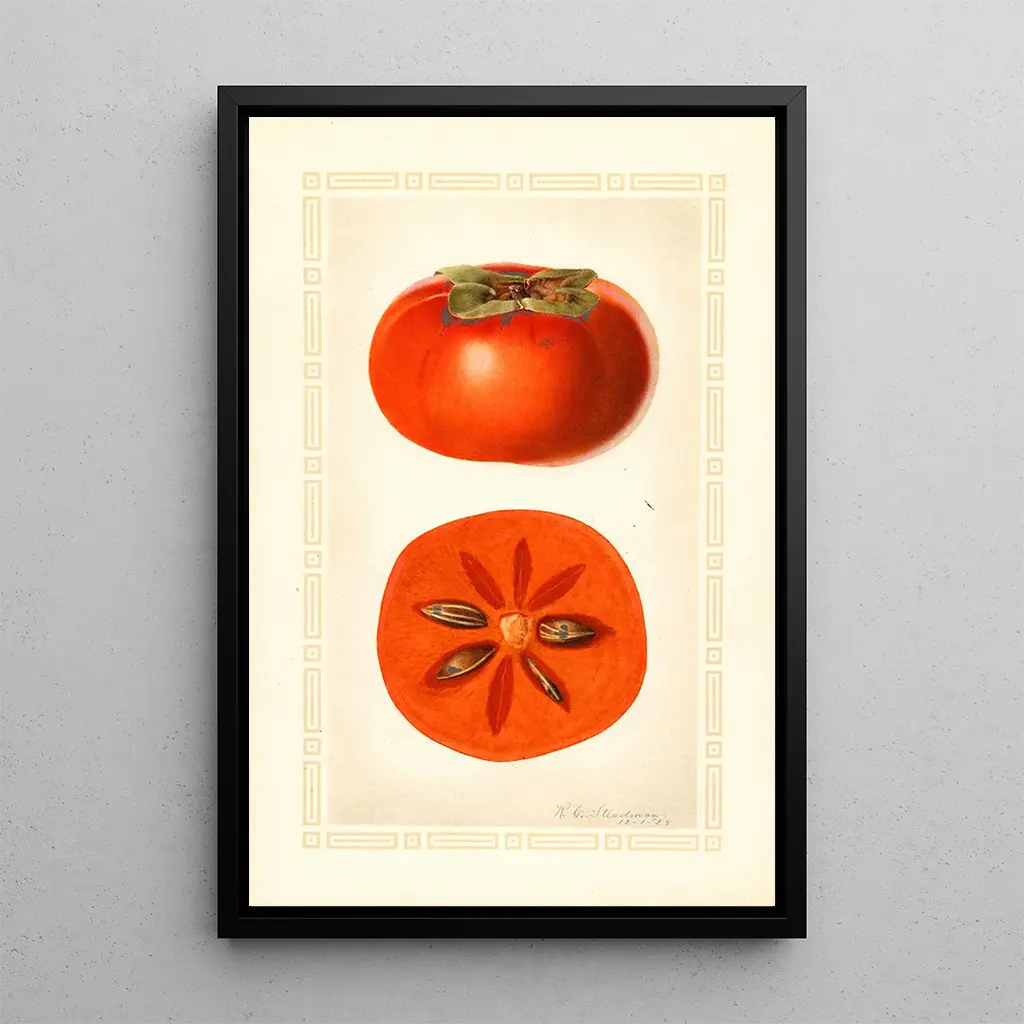 Kunsttrykket Diospyros Fuyu af Royal Charles Steadman indfanger essensen af efteråret gennem en livlig gengivelse af kaki-frugten. De varme og lyse farver i denne frugt, der spænder fra gyldent gult til strålende orange, fremkalder en høst- og delingsæra. Steadmans teknik, kendetegnet ved flydende penselstrøg og omhyggelig opmærksomhed på detaljer, giver liv til dette værk og skaber en atmosfære, der både er glædesfyldt og trøstende. Hvert element, fra blade til frugt, er omhyggeligt arrangeret for at skabe en harmonisk komposition, der inviterer til eftertanke.