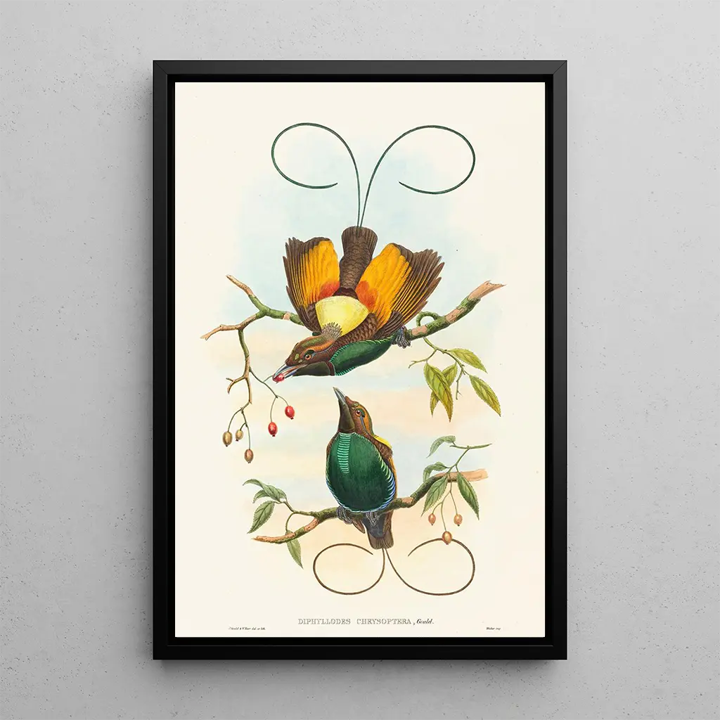 John Gould, britisk naturalist og ornitolog fra det 19. århundrede, markerede sin tid med sine illustrationer af enestående præcision. Påvirket af de videnskabelige opdagelser i sin tid, dedikerede han sit liv til at skildre fugle og insekter, hvilket bidrog til viden om biodiversitet. Hans værker, herunder kunsttrykket Diphyllodes chrysoptera, vidner om en realistisk og detaljeret stil, der er karakteristisk for naturalismens bevægelse. Gould samarbejdede også med forskere og opdagelsesrejsende, hvilket gav ham adgang til sjældne prøver, som han immortaliserede gennem sit kunstværk, og efterlod en varig arv inden for videnskabelig illustration.