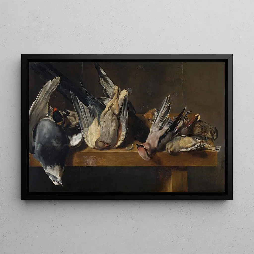 Kunsttrykket Oiseaux morts af Elias Vonck tager os med ind i en verden, hvor skønhed og melankoli mødes. Dette maleri, rigt på detaljer, præsenterer en omhyggeligt sammensat komposition af fugle, der fanger livets skrøbelighed. De mørke og jordnære farver, blandet med lysstrøg, skaber en atmosfære, der er både realistisk og eftertænksom. Teknikken med chiaroscuro, karakteristisk for kunstneren, understreger scenens drama og inviterer betragteren til at reflektere over dødeligheden og naturens flygtige skønhed.