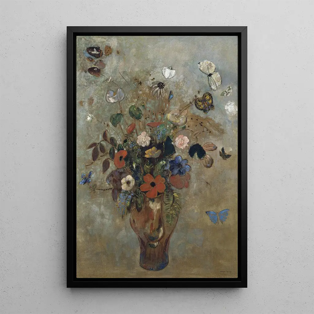 Odilon Redon, født i 1840, er en kunstner, der har formået at overskride tidens konventioner for at udforske den imaginære dybde. Påvirket af symbolismen skabte han et visuelt univers befolket af fantastiske væsener og drømmeagtige landskaber. Hans skabende periode strækker sig over flere årtier, hvor han eksperimenterede med forskellige medier, herunder litografi og maleri. Nature morte med blomster vidner om hans interesse for naturens og skønhedens temaer, samtidig med at det afslører hans talent for at fange intense følelser gennem delikate kompositioner. Redon har således efterladt en varig arv, der har inspireret mange kunstnere gennem tiderne.