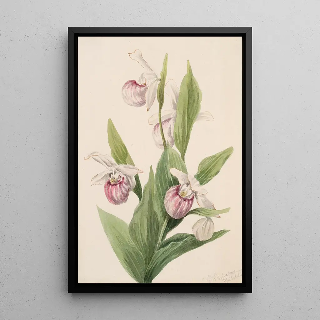 Kunsttrykket af Sabot de la reine afslører en blomsterkomposition med sjælden elegance. De livlige nuancer af gult og violet flettes yndefuldt sammen, hvilket skaber en slående kontrast, der straks fanger øjet. Akvarelteknikken, mestret af Mary Vaux Walcott, gør det muligt at gengive de fine teksturer af kronblade og blade, samtidig med at den luftige lethed bevares. Dette værk fremkalder magien i haver, hvor hver blomst fortæller en historie, og inviterer betragteren til at forundres over naturens flygtige skønhed.