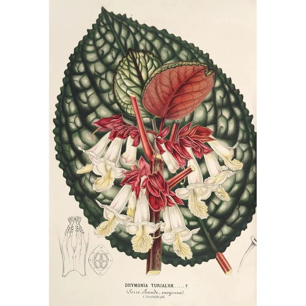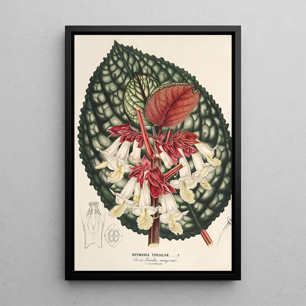 Kunsttrykket af Drymonia Turialv, et ikonisk værk af Charles Antoine Lemaire, tager os med ind i en frodig botanisk verden. De livlige farver på dette lærred fremkalder rigdommen i tropiske regnskove, med strålende grønne nuancer og indslag af rød og gul, der lyser kompositionen op. Lemaires teknik, der kombinerer botanisk præcision med kunstnerisk følsomhed, skaber en atmosfære, der er både realistisk og poetisk. Hvert blad, hver blomst synes at vibrere under en let brise, hvilket inviterer betragteren til en rolig refleksion over den naturlige skønhed.