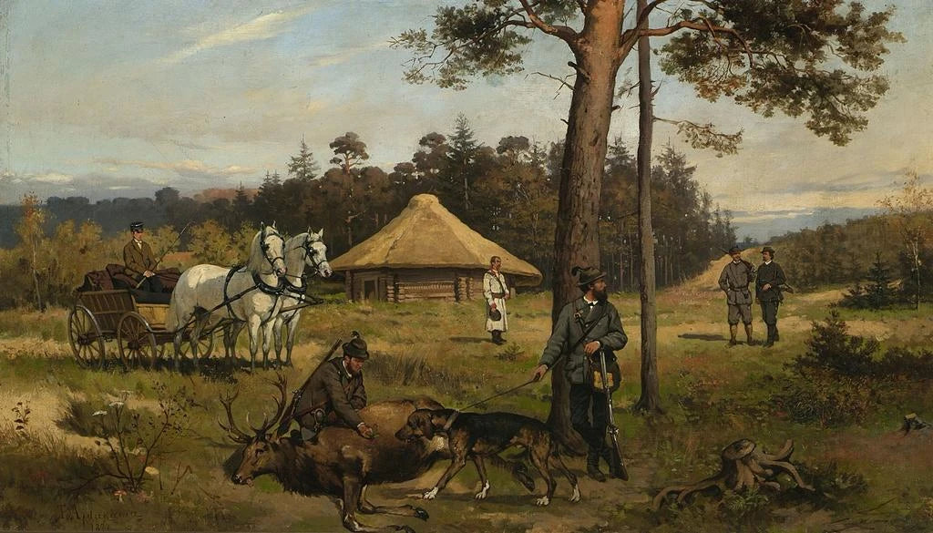Efter hjortejagten, et fængslende kunsttryk af Tadeusz Ajdukiewicz, inviterer os til at betragte et øjebliks fred efter jagtens ophidselse. Kompositionen skildrer figurer, omgivet af en frodig natur, hvor jord- og grønne nuancer smelter sammen for at skabe en fredelig atmosfære. De omhyggelige detaljer i kostumerne og udtrykkene hos personerne tilføjer en menneskelig dimension til scenen, mens det bløde lys, der filtreres gennem træerne, styrker følelsen af ro. Ajdukiewicz formår at fange essensen af et ophængt øjeblik, hvor naturen og mennesket eksisterer i harmoni.
