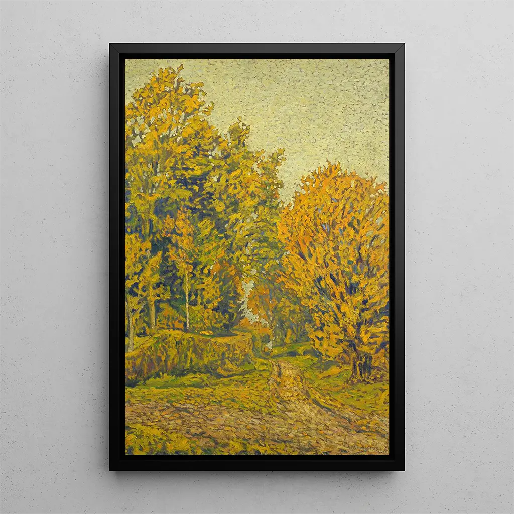 Det kunsttryk "Paysage d'automne Baccarat" af Michel Auguste Colle indfanger den flygtige skønhed i efterårsæsonen. De varme farver, der spænder fra brændende orange til gyldne gule, blander sig harmonisk for at skabe en fredelig og eftertænksom atmosfære. Colles teknik, der kombinerer præcision og flydende penselstrøg, gør det muligt at føle den lette brise, der bevæger bladene. Dette landskab, badet i blødt lys, inviterer betragteren til at dykke ned i naturens ro, samtidig med at det vækker melankoli over en cyklus, der nærmer sig sin afslutning.