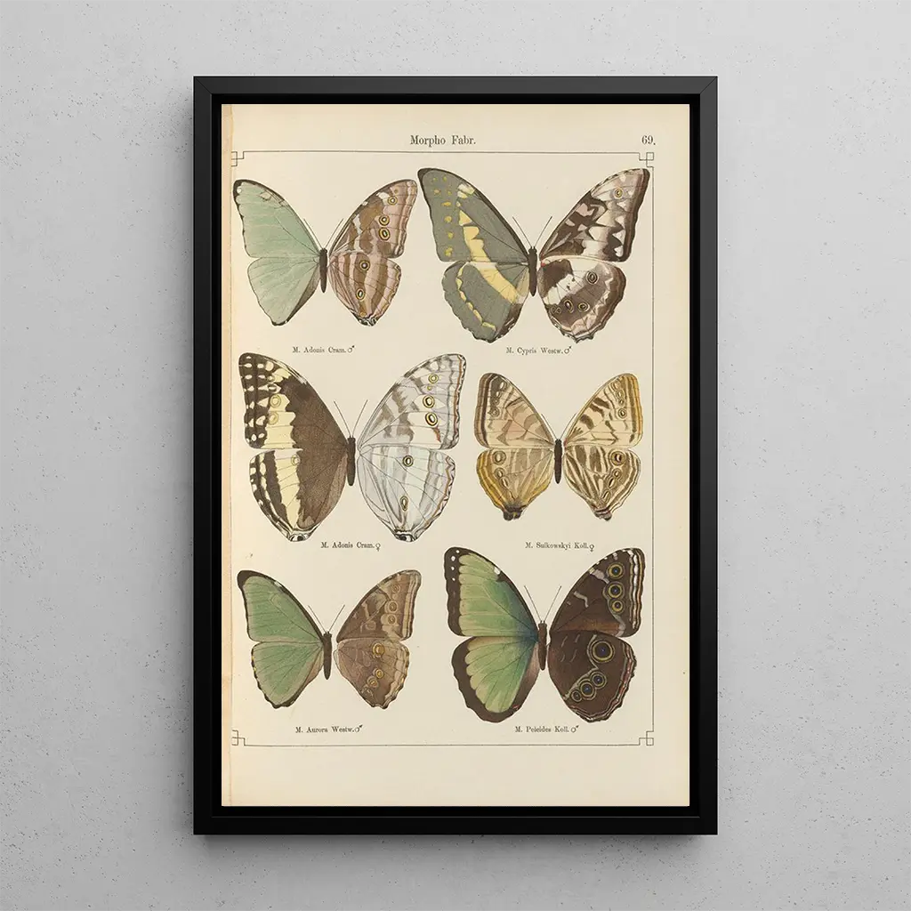 Kunsttrykket af "Papillons exotiques Pl069" af Otto Staudinger er en sand hyldest til naturens skønhed. De livlige farver på sommerfuglenes vinger, fra skarpe blå til gyldne gule, blander sig harmonisk for at skabe en atmosfære, der både er glædesfyldt og beroligende. Akvarelteknikken, anvendt med finesse, giver liv til hver detalje, fra de fine nervetråde i vingerne til de subtile skygger, der omgiver dem. Dette maleri inviterer til en opmærksom betragning, hvor hvert blik afslører en ny nuance og en ny følelse, som om sommerfuglene er ved at lette ud af lærredet.