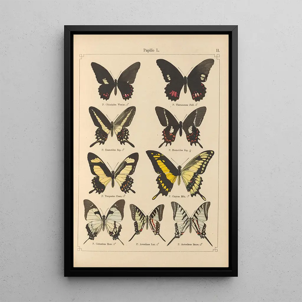 Kunsttrykket af værket "Papillons exotiques Pl011" transporterer seeren til en livlig verden, hvor naturen udtrykker sig gennem strålende farver og delikate former. Hvert sommerfugl, omhyggeligt gengivet, synes at komme til live på lærredet og skaber en let og luftige atmosfære. Nuancerne af blå, gul og orange blander sig harmonisk og fremkalder den flygtige skønhed af disse væsener. Kunstnerens teknik, der leger med skygger og lys, giver en slående dybde til hele værket og inviterer til en langvarig fordybelse.