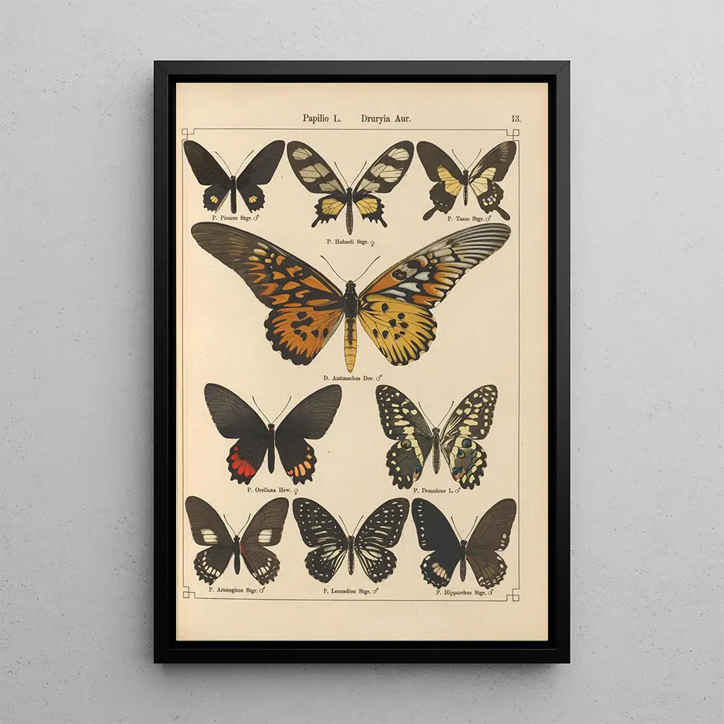 I denne kunsttryk af Papillons exotiques Pl013 tager Otto Staudinger os med ind i en livlig verden, hvor farverne væves sammen med finesse. Sommerfuglens vinger, omhyggeligt detaljerede, afslører en strålende palet af nuancer, der spænder fra azurblå til lys gul. Kompositionen er omhyggeligt afbalanceret, hver insekt synes at lette i en luftig ballet. Kunstnerens teknik, der kombinerer akvarel og gravure, skaber en let og luftig atmosfære, der inviterer betragteren til at beundre den flygtige skønhed af disse væsener. Dette maleri fremkalder en følelse af ro og forundring over biodiversitetens rigdom.