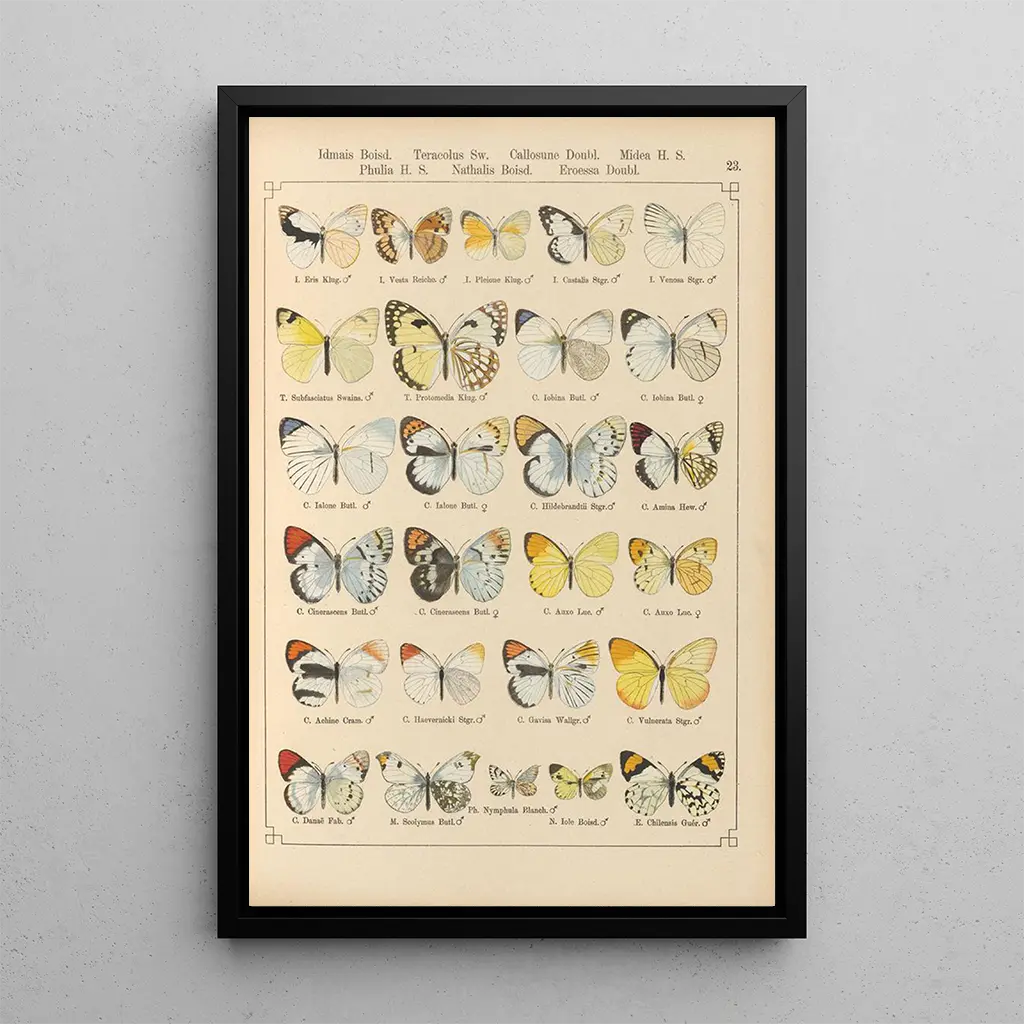 De "Eksotiske sommerfugle Pl023" af Otto Staudinger tager os med ind i et levende univers, hvor letheden af vingerne blander sig med en strålende palette. Hvert minutøst gengivet detalje fremkalder disse luftbårne skabningers ynde og delikatesse. Nuancerne af blå, gul og rød danser på lærredet og skaber en næsten eventyrlig atmosfære. Staudingers teknik, der kombinerer præcision og flydende bevægelse, gør det muligt at mærke sommerfuglenes bevægelse, som om de er ved at lette. Dette kunsttryk inviterer til fordybelse og forundring over naturens flygtige skønhed.