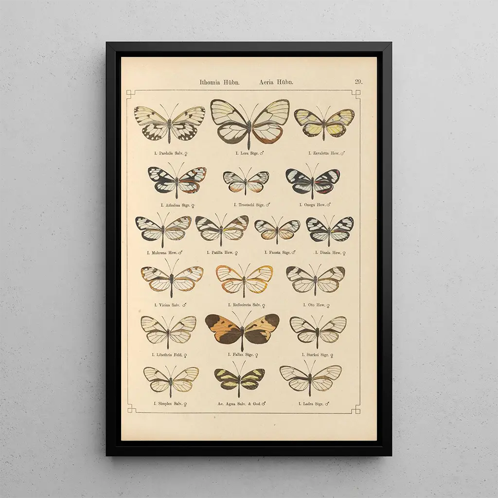 Kunsttrykket af værket "Papillons exotiques Pl029" af Otto Staudinger tager os med ind i en livlig verden, hvor naturen udtrykker sig gennem en palette af strålende farver. Hvert sommerfugl, omhyggeligt detaljeret, synes at få liv på lærredet og inviterer betragteren til at beundre deres vingeudskæringer. Nuancerne af blå, gul og orange blander sig harmonisk og skaber en atmosfære, der både er glædesfyldt og beroligende. Kunstnerens teknik, der kombinerer præcision og følsomhed, gør det muligt at føle letheden og ynde af disse flyvende væsener, hvilket forvandler dette værk til en ægte hyldest til den naturlige skønhed.