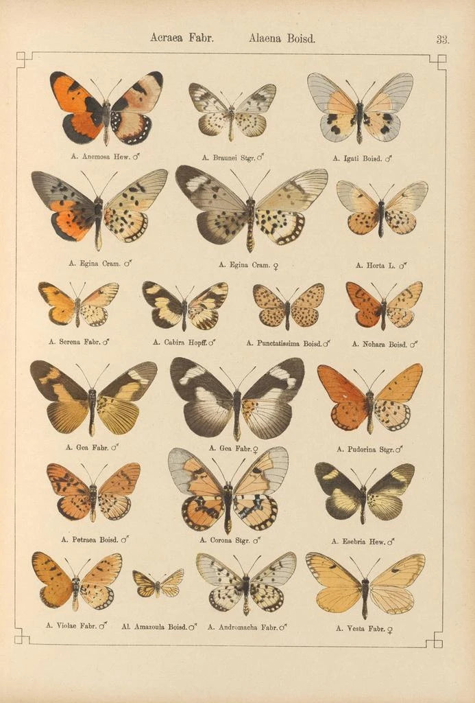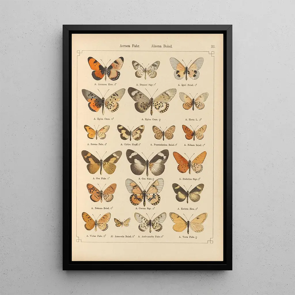 Kunsttrykket af Papillons exotiques Pl033 tager os med til en verden, hvor naturen udtrykker sig med glans og ynde. Sommerfuglene, gengivet i al deres pragt, fremviser livlige og varierede nuancer, fra den flammende rød til smaragdgrøn. Staudingers teknik, der kombinerer akvarel og tegning, hylder den skrøbelige skønhed hos disse væsener. Hvert eneste detalje, fra vinge-mønstre til fine skygger, er omhyggeligt udarbejdet, hvilket skaber en atmosfære, der er både dynamisk og beroligende, perfekt til at flygte fra hverdagens stress.