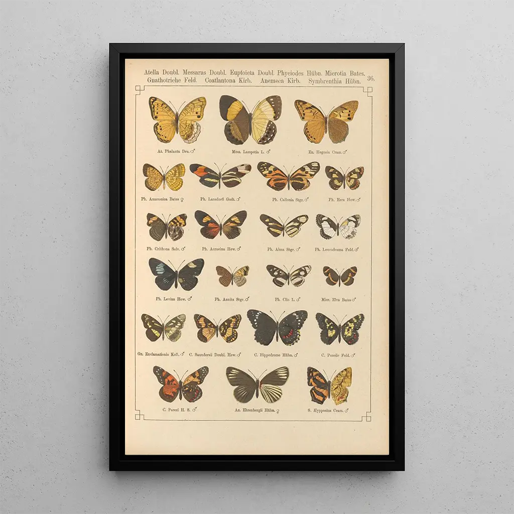 I denne kunsttryk af Eksotiske sommerfugle Pl036 tager Otto Staudinger os med ind i en livlig verden, hvor naturen udtrykker sig med glans. De skinnende farver på sommerfuglenes vinger, der spænder fra dybblå til strålende gul, skaber en atmosfære af lethed og glæde. Akvarelteknikken, anvendt med finesse, gør det muligt at fange de fine detaljer i insekterne, samtidig med at den giver en fornemmelse af bevægelse, som om disse skabninger tager liv på lærredet. Hver sommerfugl synes at lette, hvilket inviterer betragteren til at beundre naturens flygtige skønhed.