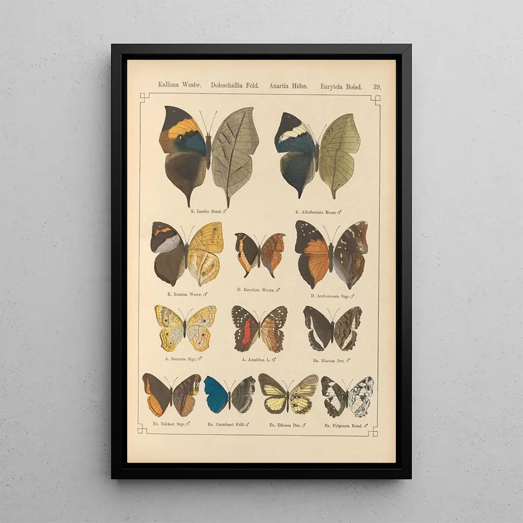 "Papillons exotiques Pl039" af Otto Staudinger er en sand hyldest til biodiversiteten, der fint illustrerer rigdommen af arter. Hvert sommerfugl, med sine unikke mønstre og livlige farver, synes at komme til live under den opmærksomme betragter. Den harmoniske komposition og den subtile brug af skygger og lys skaber en fængslende atmosfære, hvor naturen afslører sin fulde pragt. Dette kunsttryk inviterer til eftertanke og forundring og minder os om vigtigheden af at bevare den naturlige verdens skønhed, der omgiver os.