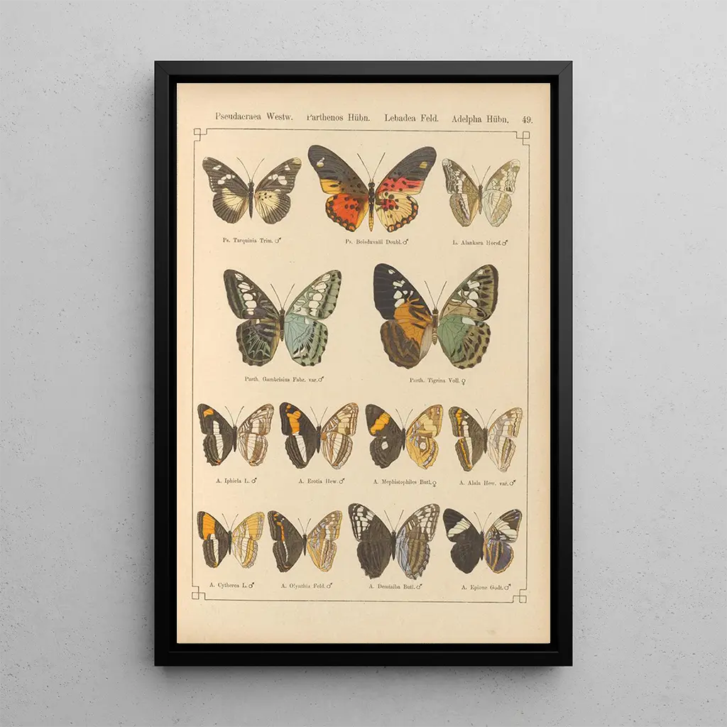 De "Papillons exotiques Pl049" af Otto Staudinger fremstår som en ægte visuel symfoni, hvor hver detalje er omhyggeligt orkestreret for at forbløffe betragteren. Farvernes rigdom, der spænder fra livlige nuancer til blidere toner, skaber en dynamisk og fængslende atmosfære. Staudingers teknik, der kombinerer præcision og følsomhed, hylder skønheden af papillons samtidig med at fremhæve deres mangfoldighed. Dette kunsttryk inviterer til en visuel udforskning, hvor hvert blik afslører nye subtiliteter og en dialog mellem kunst og natur.