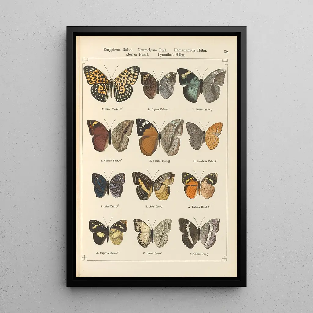 Kunsttrykket af værket "Papillons exotiques Pl052" af Otto Staudinger tager os med ind i en livlig verden, hvor de strålende farver blander sig med formernes ynde. Hvert sommerfugl, omhyggeligt detaljeret, synes at få liv på lærredet, hvilket fremkalder en lethed og en uendelig ynde. Nuancerne af blå, gul og rød flettes harmonisk sammen, hvilket skaber en atmosfære, der både er glædesfyldt og beroligende. Staudingers teknik, der kombinerer præcision og følsomhed, gør det muligt næsten at føle vingeslagene fra disse flygtige skabninger, hvilket inviterer os til at værdsætte naturens flygtige skønhed.