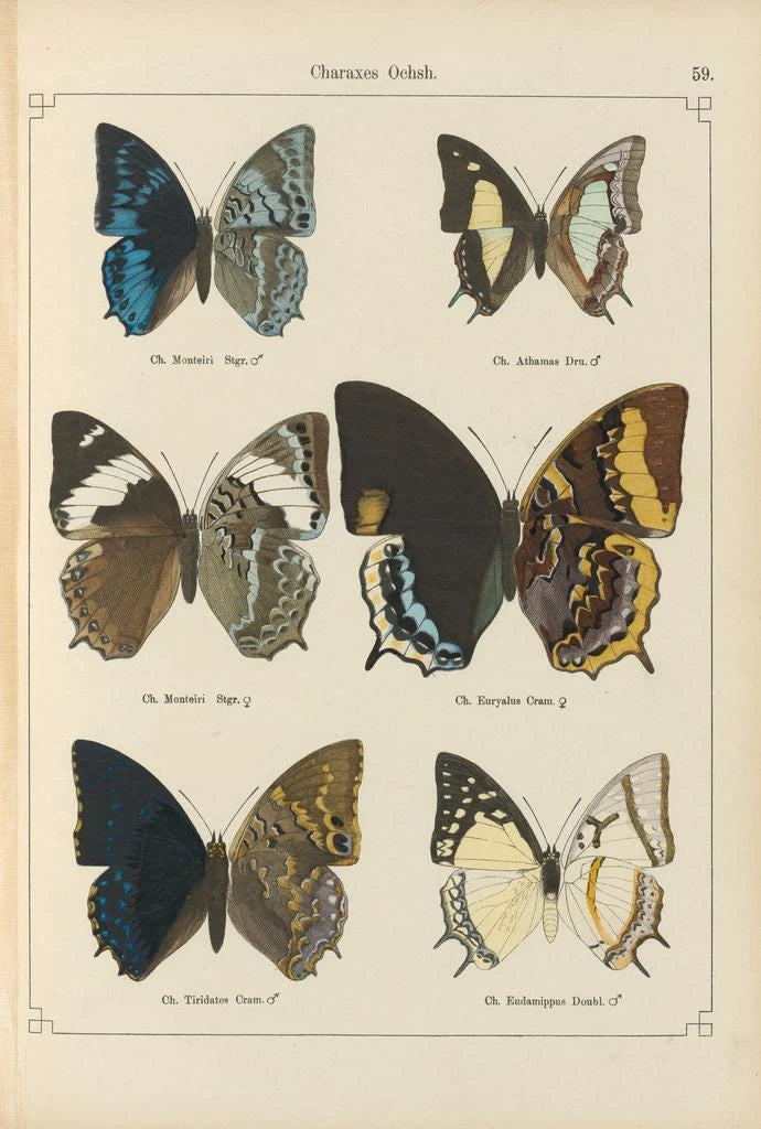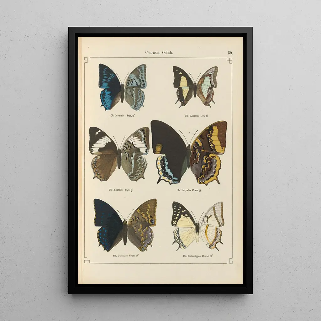 Kunsttrykket af værket "Papillons exotiques Pl059" af Otto Staudinger tager os med ind i en livlig verden, hvor naturen udtrykker sig med glans. De iøjnefaldende farver på sommerfuglenes vinger, fra dybblå til lyse gule, skaber en atmosfære, der både er glædesfyldt og beroligende. Staudingers teknik, der kombinerer præcision og finesse, gør det muligt at fange letheden af disse flygtige skabninger. Hvert detalje, fra nervetråde til mønstre, er gengivet med en omhu, der inviterer til forundring. Dette lærred fremkalder ikke kun den naturlige skønhed, men også livets skrøbelighed, og opfordrer til en stilfærdig eftertanke.