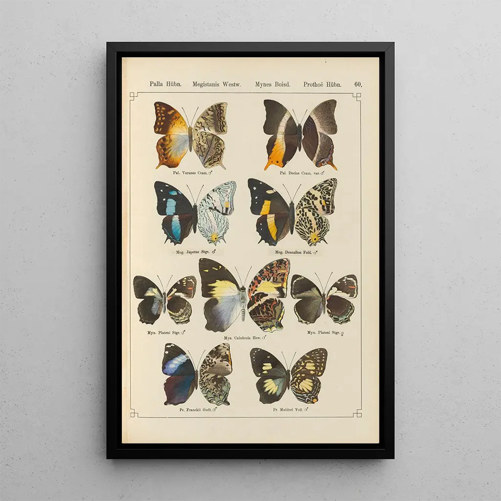 Kunsttrykket af værket "Papillons exotiques Pl060" af Otto Staudinger tager os med ind i en verden, hvor naturen afslører sig med en uovertruffen rigdom. De skinnende nuancer på vingerne, der spænder fra brændende røde til strålende grønne, skaber et fængslende visuelt show. Staudingers teknik, der kombinerer videnskabelig præcision med kunstnerisk følsomhed, hylder den skrøbelige skønhed af disse insekter. Hvert sommerfugl, frosset i et øjeblik af ynde, synes klar til at lette, og inviterer til eftertanke og forundring over biodiversitetens mangfoldighed. Dette lærred er en hyldest til naturen, der fejrer de eksotiske sommerfugles pragt.