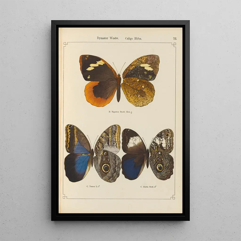 De "Papillons exotiques Pl073" af Otto Staudinger er en ægte fejring af biodiversiteten. Dette fængslende kunsttryk udvider en livlig palette af farver, fra strålende blå til lyse gule, hvilket skaber en slående kontrast, der fanger øjet. Akvarelteknikken giver liv til disse delikate væsener, hvilket gør hvert detalje, fra gennemsigtige vinger til komplekse mønstre, næsten håndgribeligt. Atmosfæren, der udspringer af dette lærred, inviterer til forundring og eftertanke, som om man næsten kan høre summen af sommerfuglenes vinger.