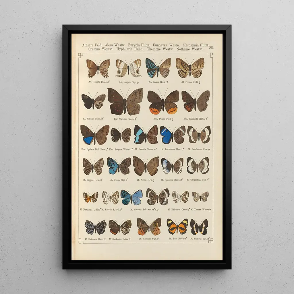 De "Papillons exotiques Pl088" af Otto Staudinger indfanger selve essensen af naturlig skønhed gennem en eksplosion af livlige farver. Hvert detalje, fra de delikate vinger med ornamentik til de strålende nuancer, fremkalder en atmosfære af lethed og ynde. Akvarelteknikken, anvendt med mesterlighed, skaber subtile overgange, der giver liv til disse flygtige væsener. Kunstværket inviterer til en stille eftertanke, hvor man næsten kan høre de blide vingeslag fra disse sommerfugle, der svæver i en frodig have.