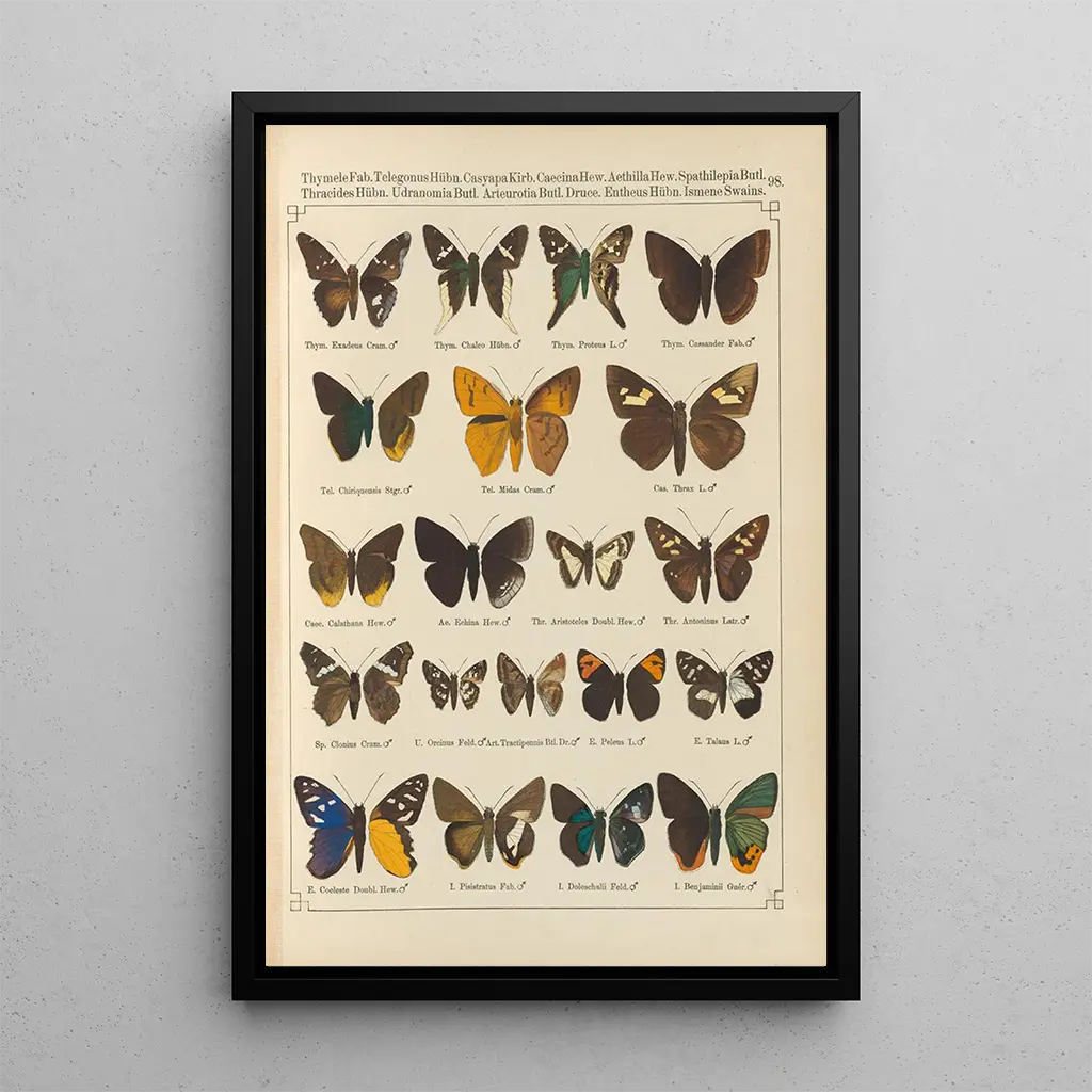 De "Papillons exotiques Pl098" af Otto Staudinger indfanger selve essensen af naturlig skønhed gennem en livlig palet og detaljerede finisher. Hvert sommerfugl er gengivet med bemærkelsesværdig præcision, hvilket fremhæver de strålende nuancer på deres vinger. Blå, gule og røde nuancer blandes harmonisk, hvilket skaber en atmosfære, der både er glædesfyldt og beroligende. Akvarelteknikken, anvendt med finesse, tilføjer lethed til værket, som om sommerfuglene tager liv på lærredet. Denne kunsttryk inviterer til en stille eftertanke, hvor man næsten kan høre de blide vingeslag.