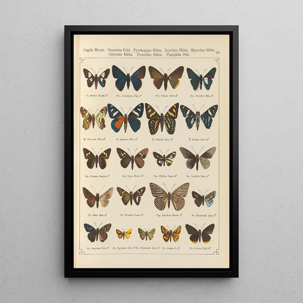 "Papillons exotiques Pl099" af Otto Staudinger tilbyder en fascinerende vision af biodiversiteten gennem en kunstnerisk repræsentation rig på farver og detaljer. Hvert sommerfugl er omhyggeligt illustreret, hvilket fremhæver artsdiversiteten og skønheden i deres mønstre. De livlige farver, der spænder fra dybe grønne til lyse orange nuancer, skaber en livlig og dynamisk atmosfære. Teknikken med akvarel, anvendt med mesterlighed, giver liv til disse delikate væsener og fremkalder en følelse af flugt til fjerne egne. Denne kunsttryk er en sand hyldest til naturen, der inviterer til eftertanke og forundring.