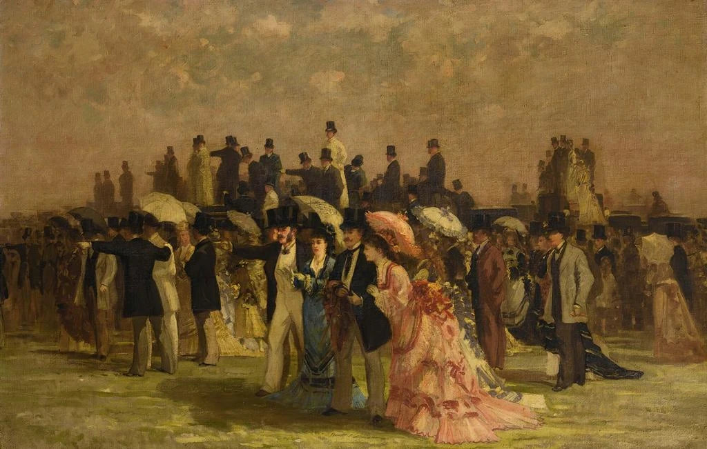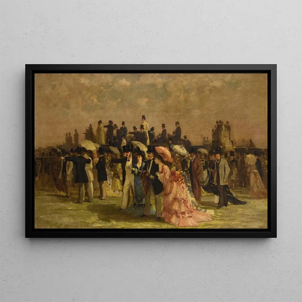 I dette livlige værk fanger Louis Abel-Truchet stemningen af en løbsdag, hvor elegante kvinder bevæger sig yndefuldt. De skinnende farver og de raffinerede detaljer i kjolerne fremkalder en atmosfære af luksus og sofistikeret elegance. Kunstnerens teknik, der blander impressionisme og realisme, giver liv til hver enkelt person, mens uklarheden i baggrunden antyder bevægelse og spænding ved begivenheden. Kvindernes ansigter, selvom de er stiliserede, formidler en dybde af følelser, hvilket inviterer betragteren til at fordybe sig i denne livlige scene.