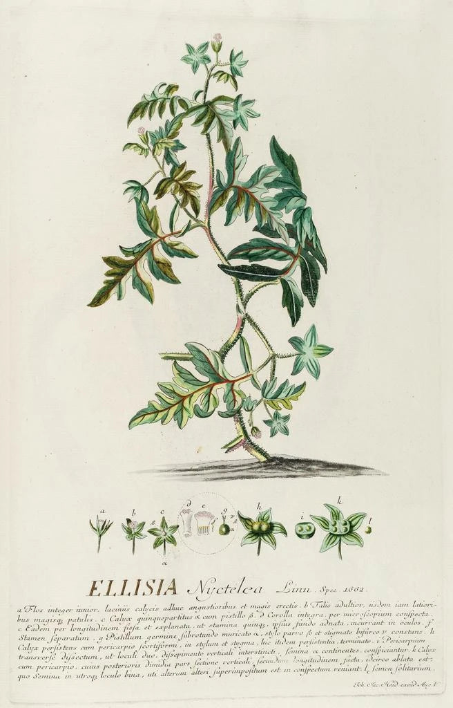"Ellisia" af Georg Dionysius Ehret er et kunsttryk, der fremkalder lethed og ynde i blomster. På dette lærred blander de livlige farver sig harmonisk, hvilket skaber et levende maleri, der synes at vibrere under lyset. Den delikate akvarelteknik tillader hvert detalje at komme fuldt ud til udtryk, fra konturerne af kronbladene til de subtile nuancer i bladene. Atmosfæren, der udspringer af dette kunsttryk, er både glædesfyldt og beroligende, og inviterer betragteren til at dykke ned i en blomstrende verden, hvor hvert element fortæller en historie. Den afbalancerede og dynamiske komposition fanger øjet og fantasien, hvilket gør "Ellisia" til et fængslende kunsttryk.
