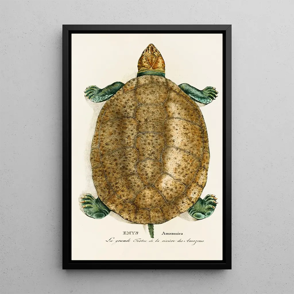 Kunsttrykket af Emys Amazonica, udført af Johann Baptist von Spix, tager os med til dybderne af Amazonas, hvor biodiversiteten blomstrer. Dette maleri fremhæver en ferskvandstortyr, der indfanger denne fascinerende organismes ynde og elegance. De jordnære farver og grønne nuancer afspejler rigdommen i dens naturlige habitat, mens de præcise detaljer i skjoldet og vandrefleksionerne skaber en fordybende atmosfære. Værket, både videnskabeligt og kunstnerisk, inviterer til en respektfuld betragning af naturen og dens vidundere.