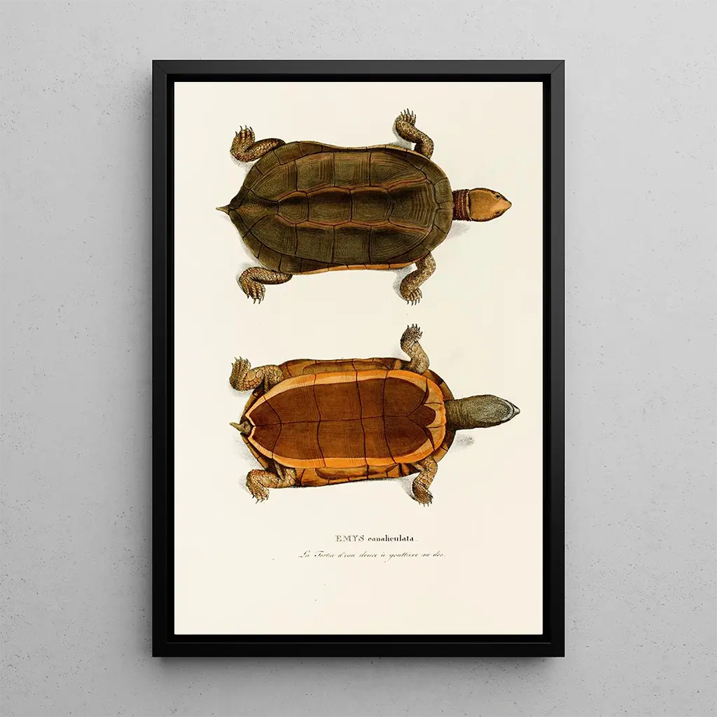 Reproduktionen af "Emys Canaliculata" er et ideelt dekorativt stykke til at berige dit hjem, uanset om det er i stuen, på kontoret eller i soveværelset. Dets trykkvalitet og trofasthed mod detaljerne i det originale værk gør det til et attraktivt valg for kunst- og naturentusiaster. Dette maleri tilføjer et strejf af elegance og ro til dit rum, samtidig med at det fremkalder samtaler om biodiversitet og skønheden i den naturlige verden. Ved at vælge dette lærred, vælger du en dekoration, der er både æstetisk tiltalende og meningsfuld, og som vil fange alles opmærksomhed.