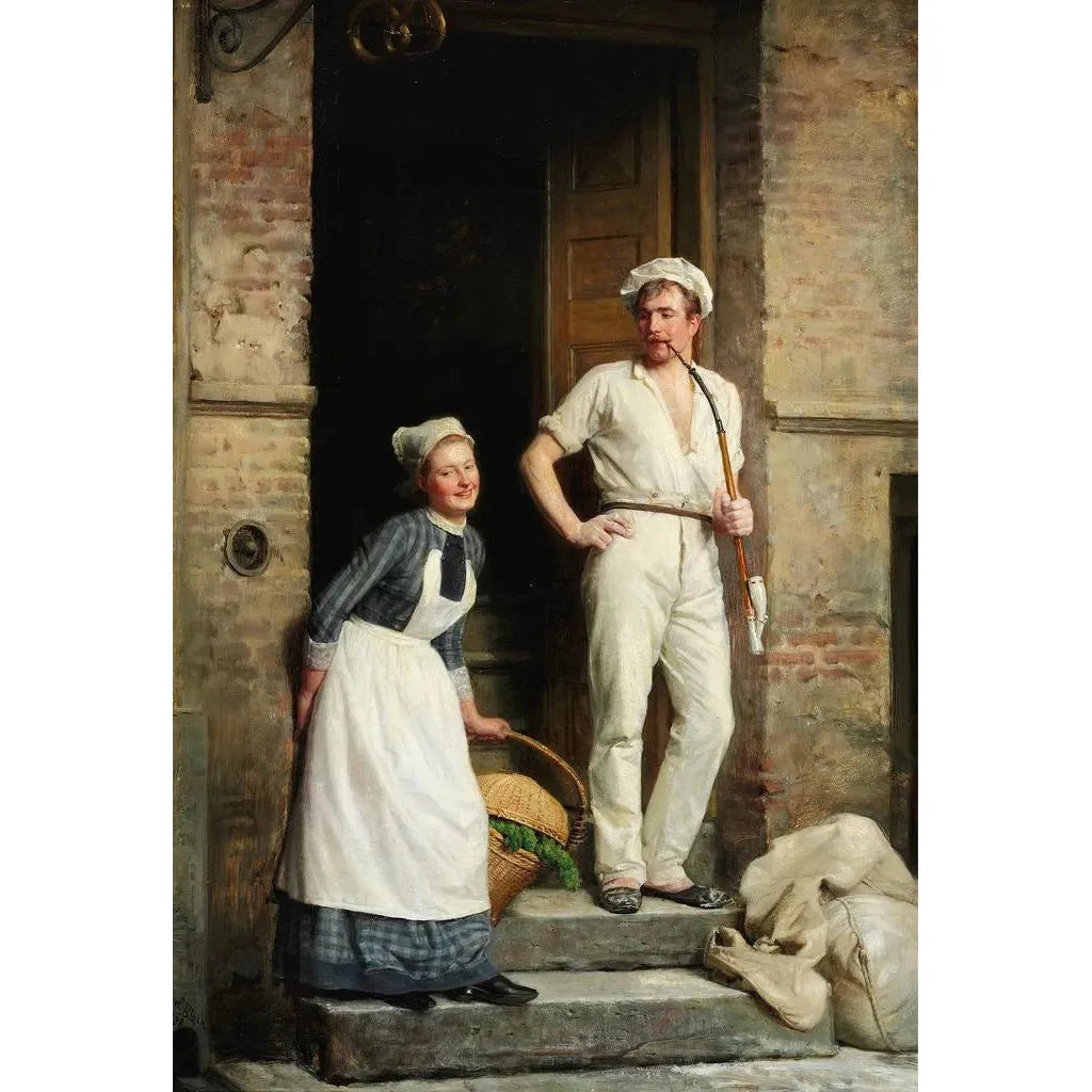 I "Et kunsttryk af en bager, der køler sig ned" fanger Carl Bloch et øjeblik af dagligdagen med bemærkelsesværdig finesse. Szenen, badet i lys, fremhæver en bager i en pause, hvilket giver et intimt indblik i hans hverdag. De varme og jordnære farver, typiske for Blochs stil, skaber en varm og indbydende atmosfære. Kunstnerens teknik, der kombinerer realisme og minutøse detaljer, gør det muligt at mærke friskheden i øjeblikket, som om man er vidne til en velfortjent pause i en dedikeret håndværkers liv.