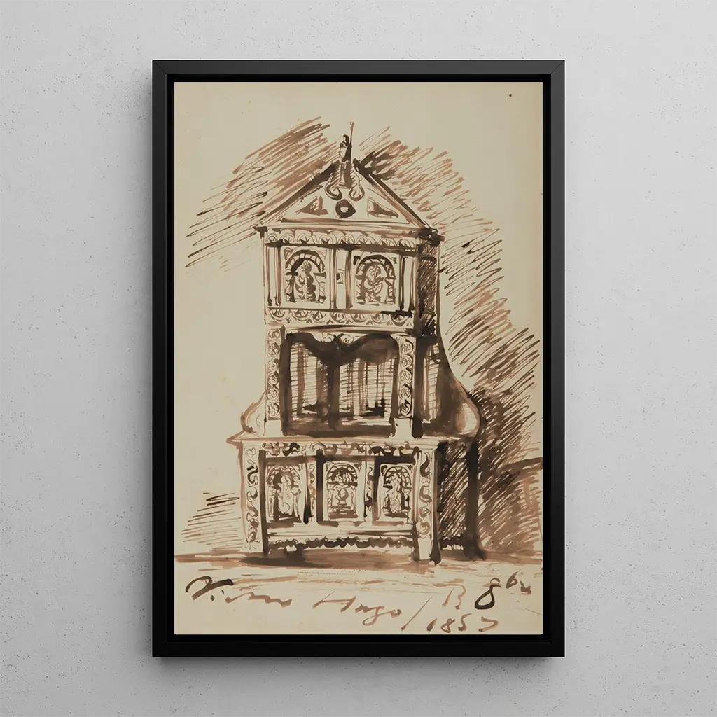 Maleriet "Un buffet" af Victor Hugo tager os med ind i en verden, hvor håndværk møder naturen. Kompositionen, rig på detaljer, fremhæver et møbel i træ, udsmykket med fine blomstermotiver. De varme farver, fra dybe brune til bløde grønne nuancer, skaber en indbydende og varm atmosfære. Hugos malerteknik, der blander realisme og romantik, giver liv til dette hverdagsobjekt og forvandler det til et fuldgyldigt kunstværk. Hvert penselstrøg synes at fortælle en historie og inviterer betragteren til at dvæle ved skønheden i de enkle ting.