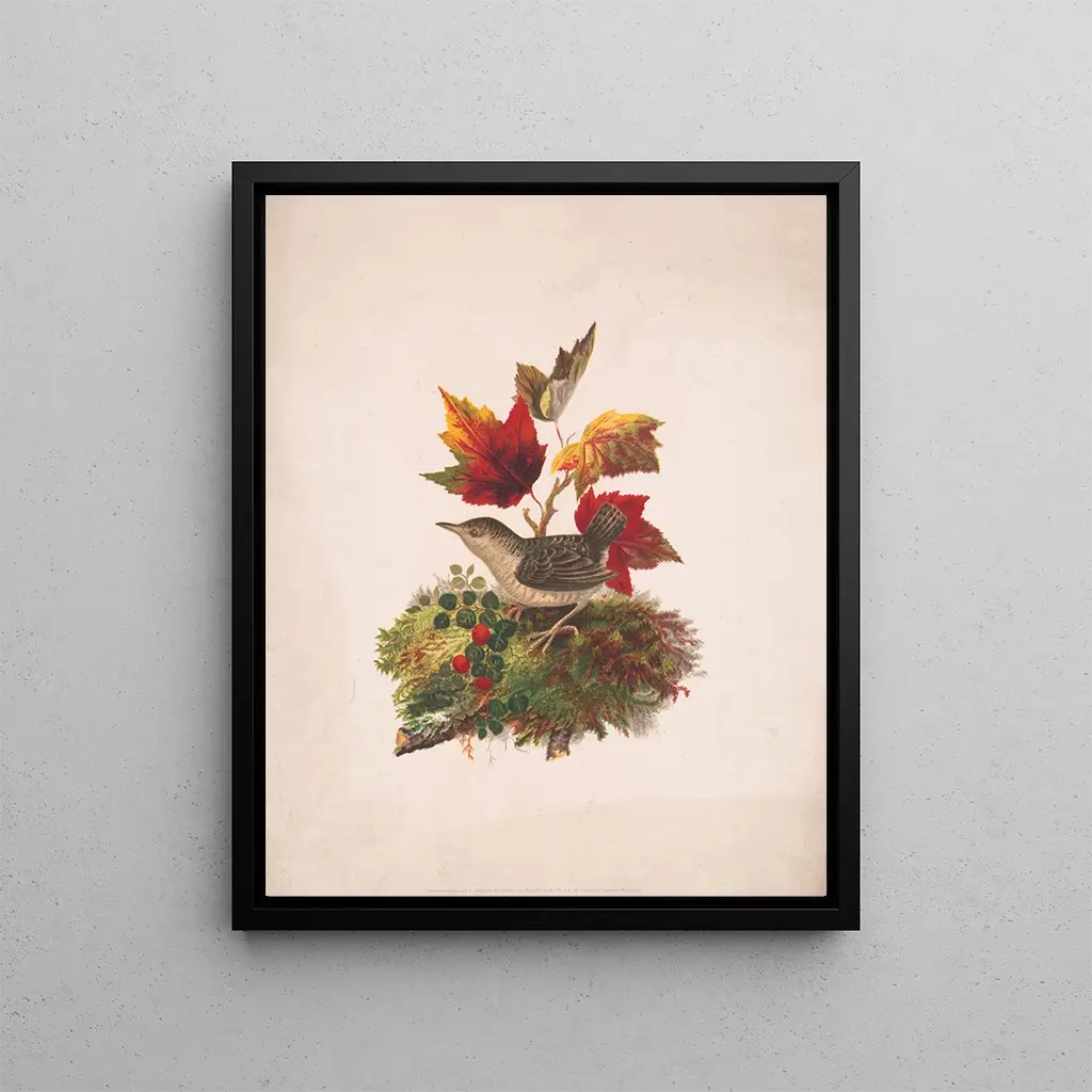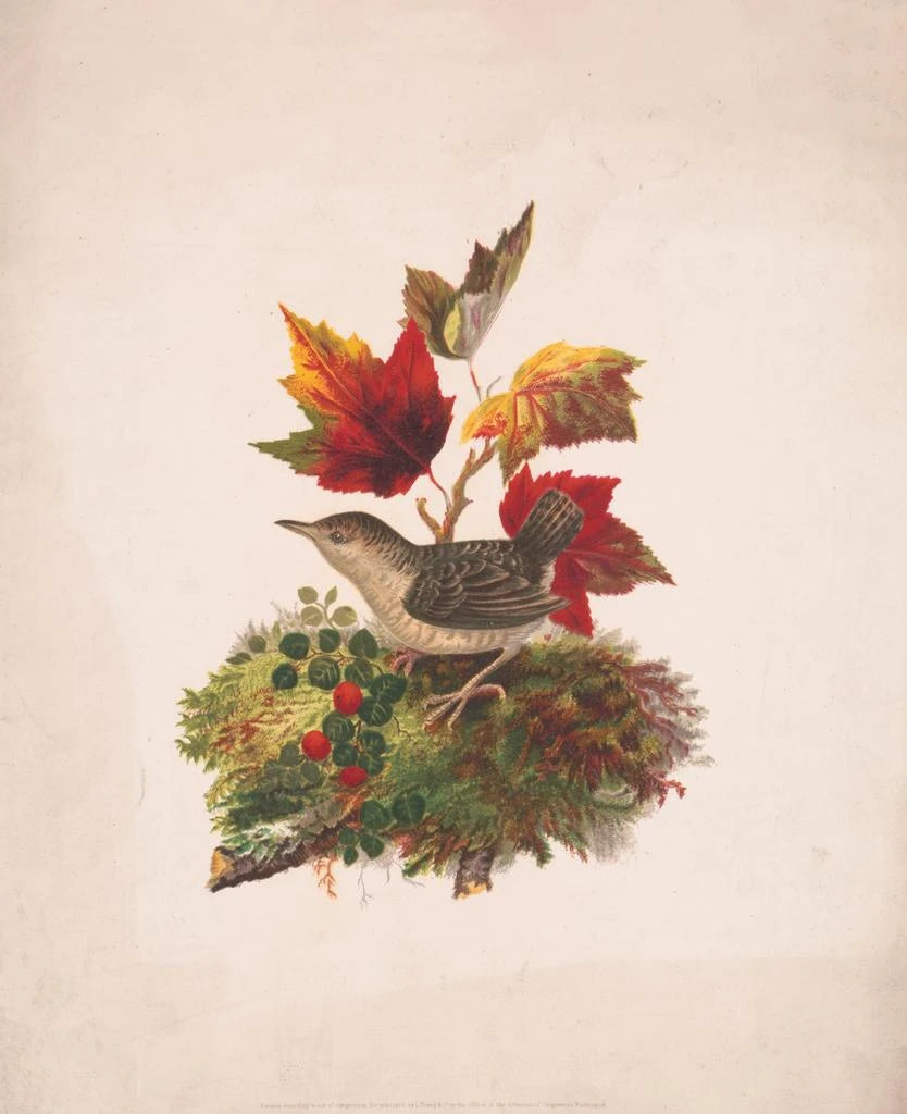Maleri En fugl med efterårsblade - Louis Prang Co | Kunsttryk